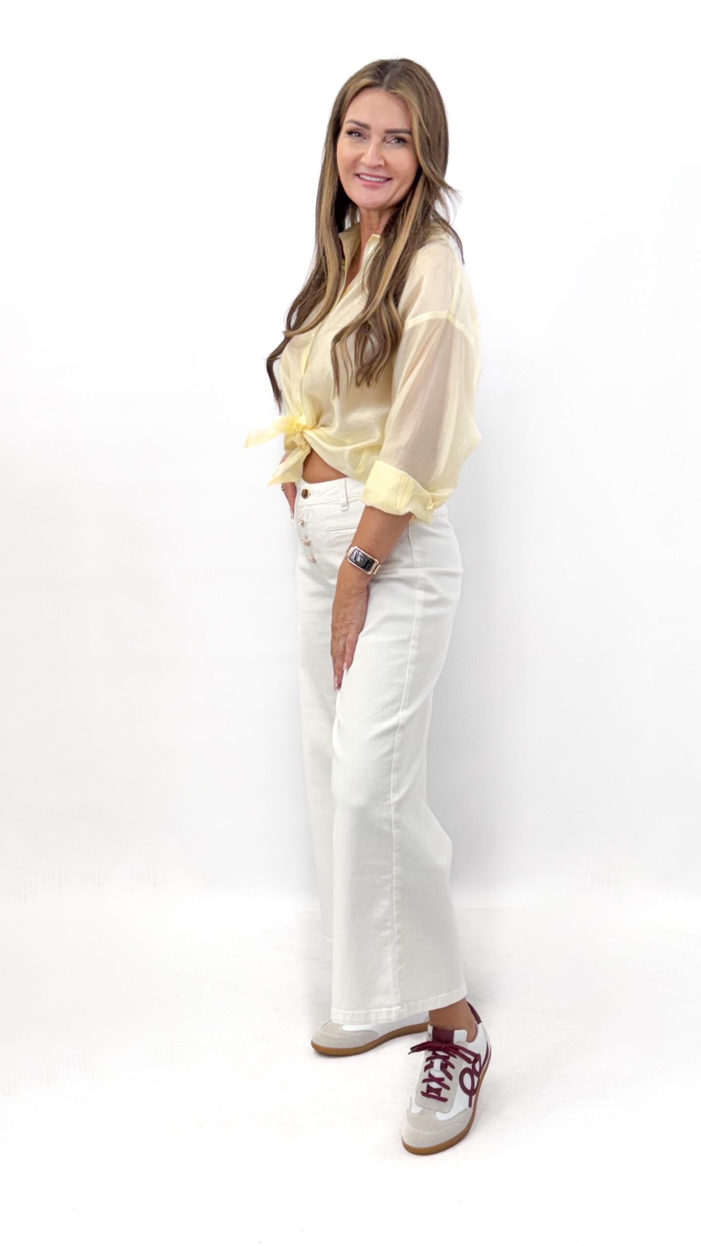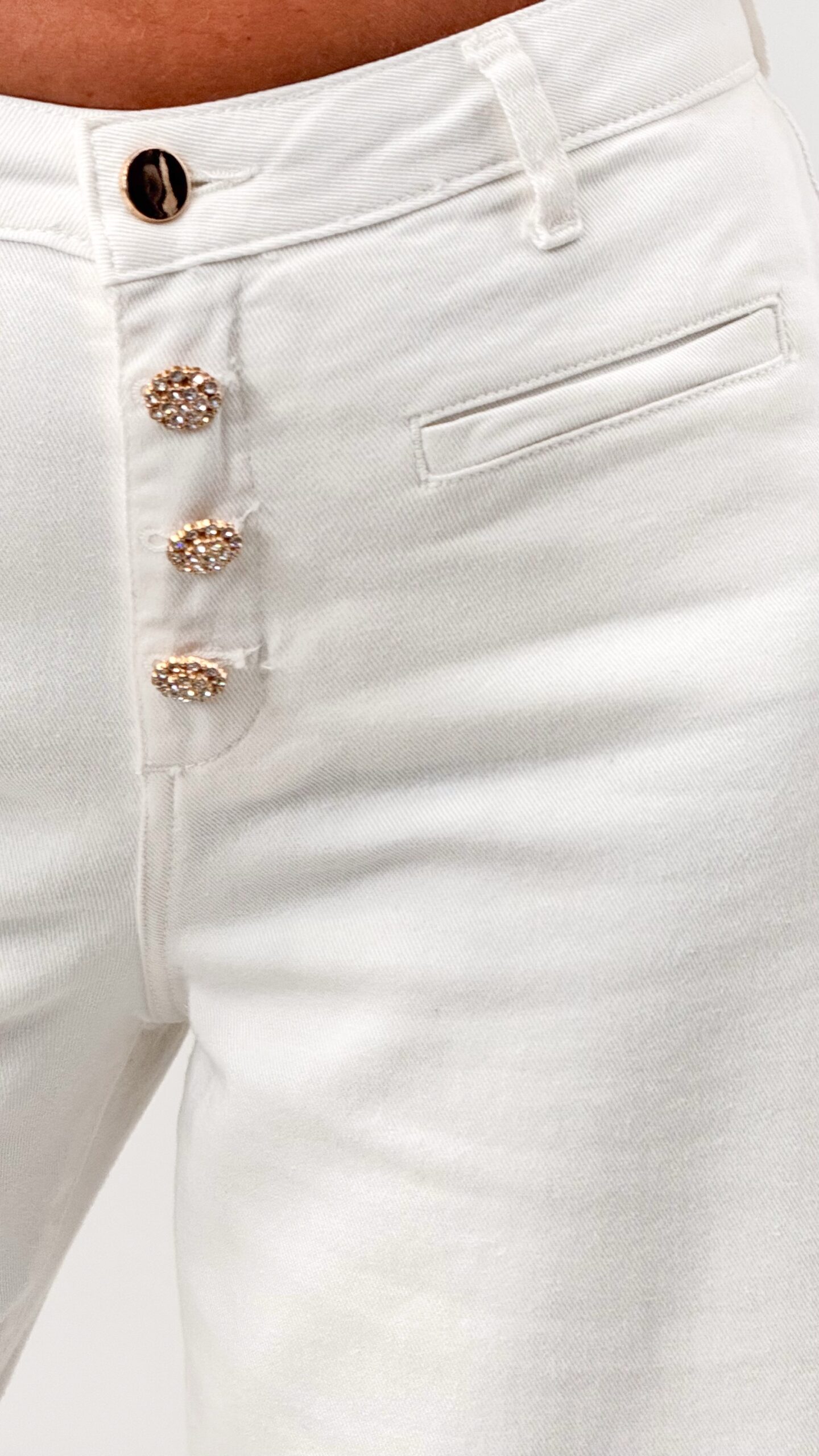 Białe jeansy z szeroką nogawką i ozdobnymi złotymi guzikami. Stylowe i wygodne – idealne na lato, do eleganckich i codziennych stylizacji.