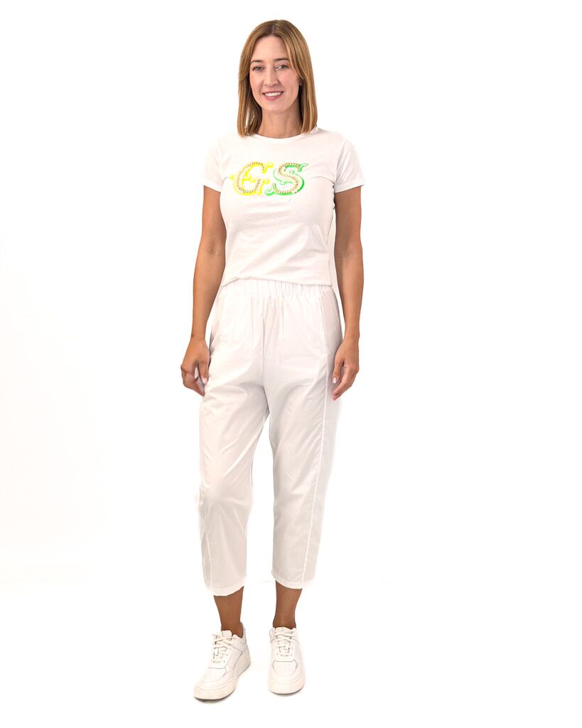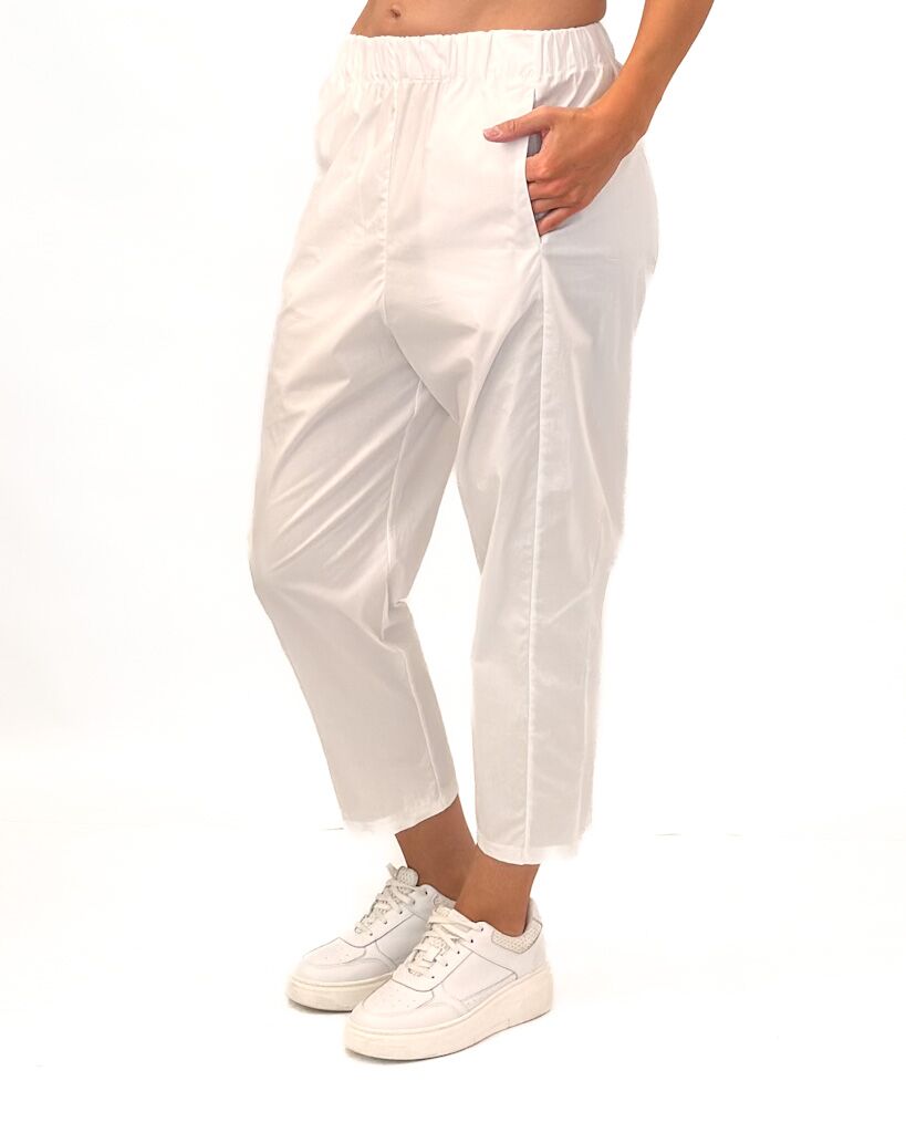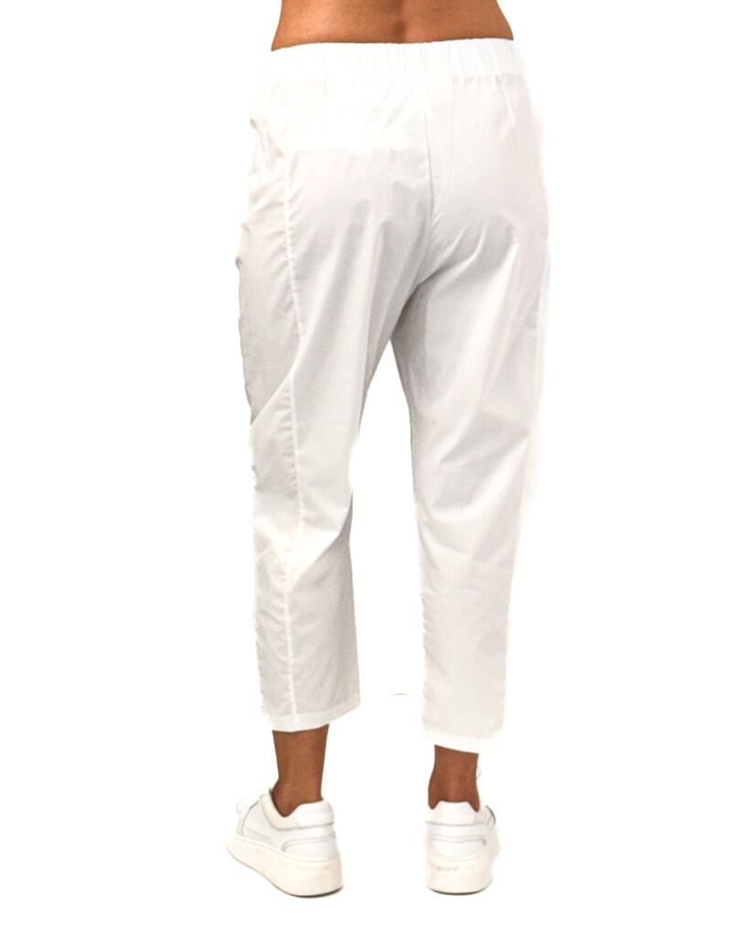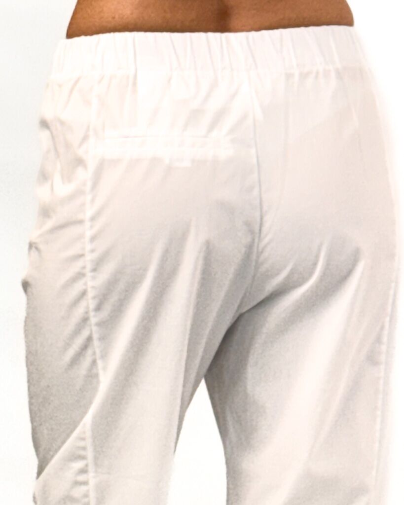 Cienkie, białe spodnie z materiału — luźne w udach, zwężane ku dołowi. Posiadają stylowe przeszycie na nogawce oraz gumkę w pasie. Idealne na lato — lekkie i wygodne.