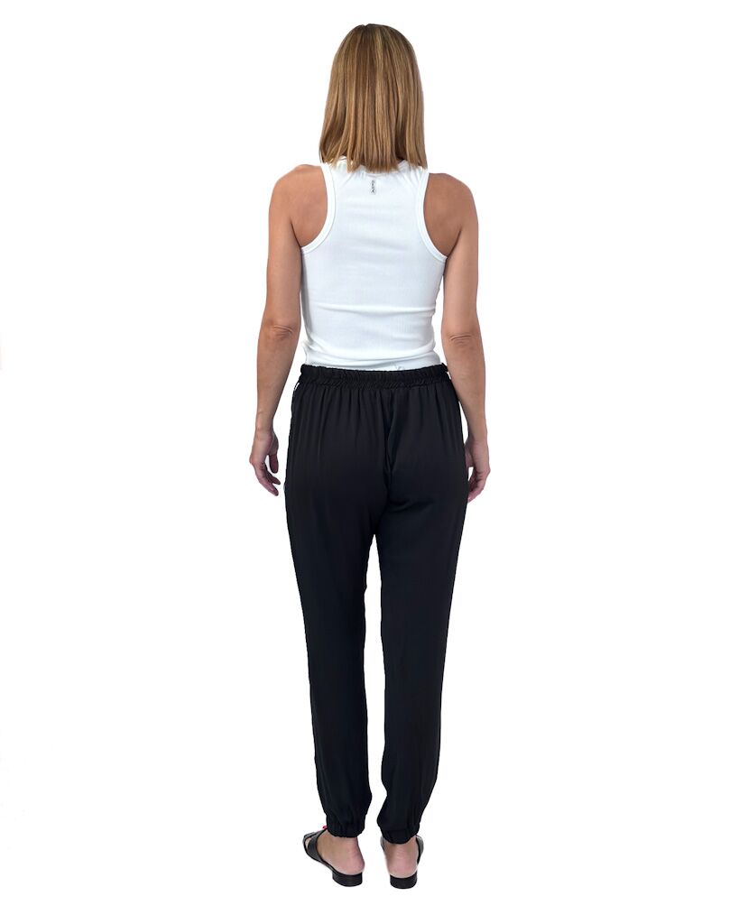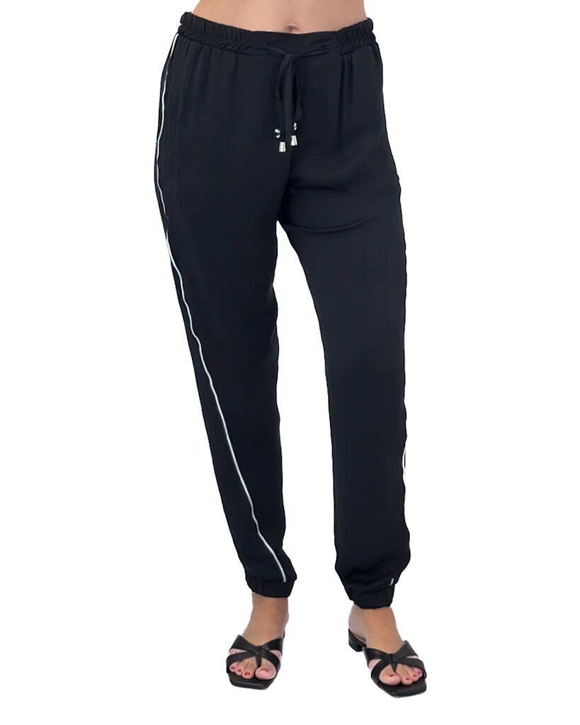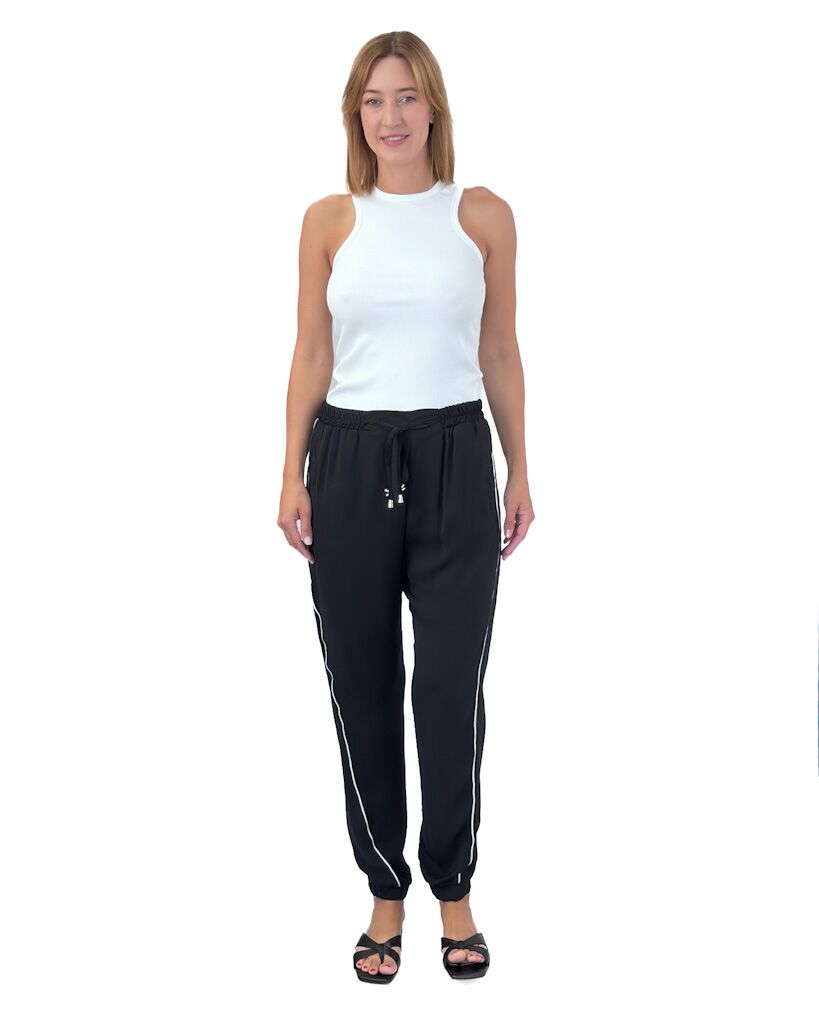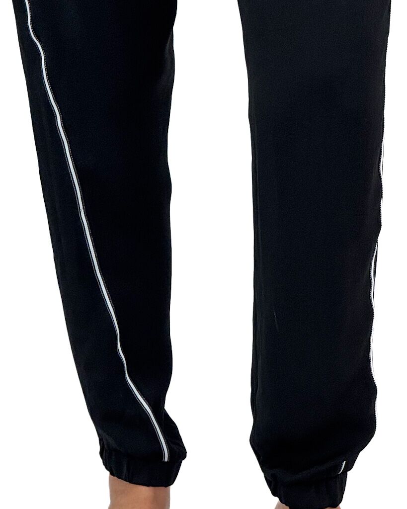 Czarne cienkie spodnie z materiału z białym lampasem. Eleganckie i sportowe jednocześnie – wygodne, stylowe i dopasowane na każdą okazję.