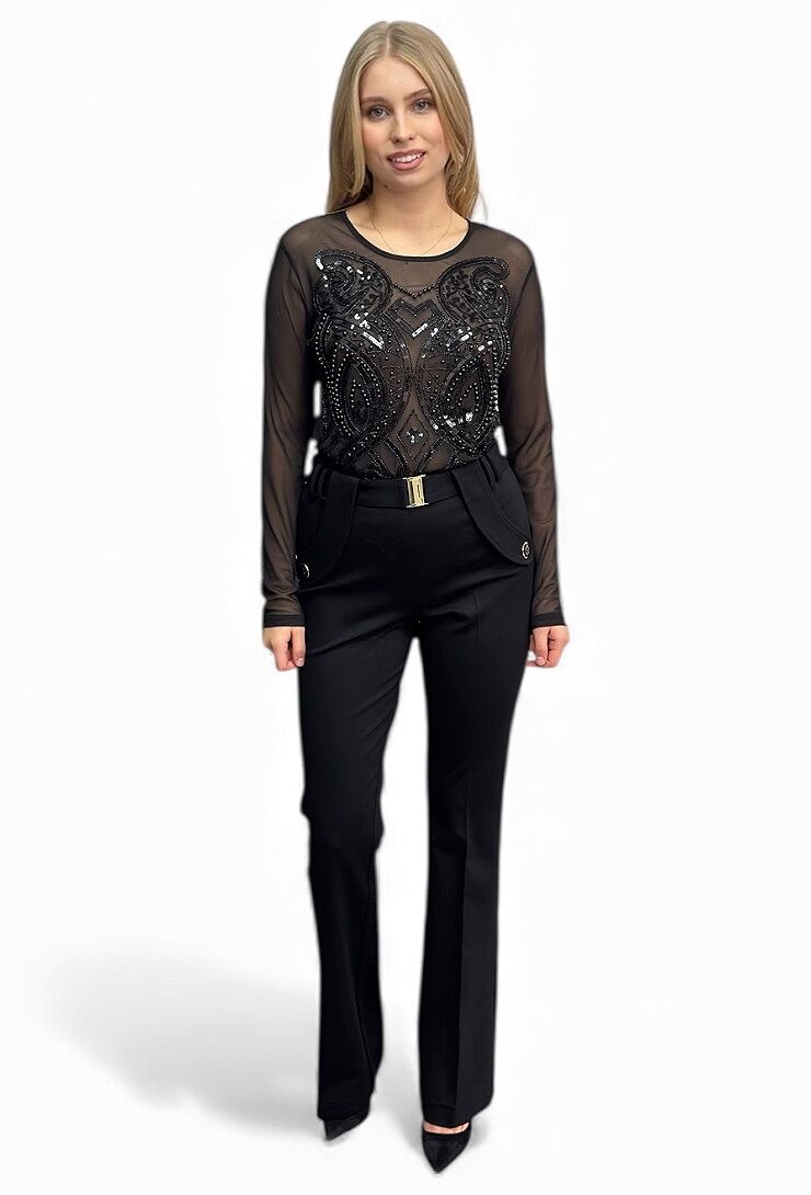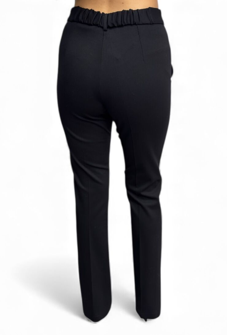 Stylowe czarne, eleganckie spodnie z materiału z ozdobnym paskiem. Elegancja, wygoda i perfekcyjne dopasowanie – idealne do pracy i na wieczór.