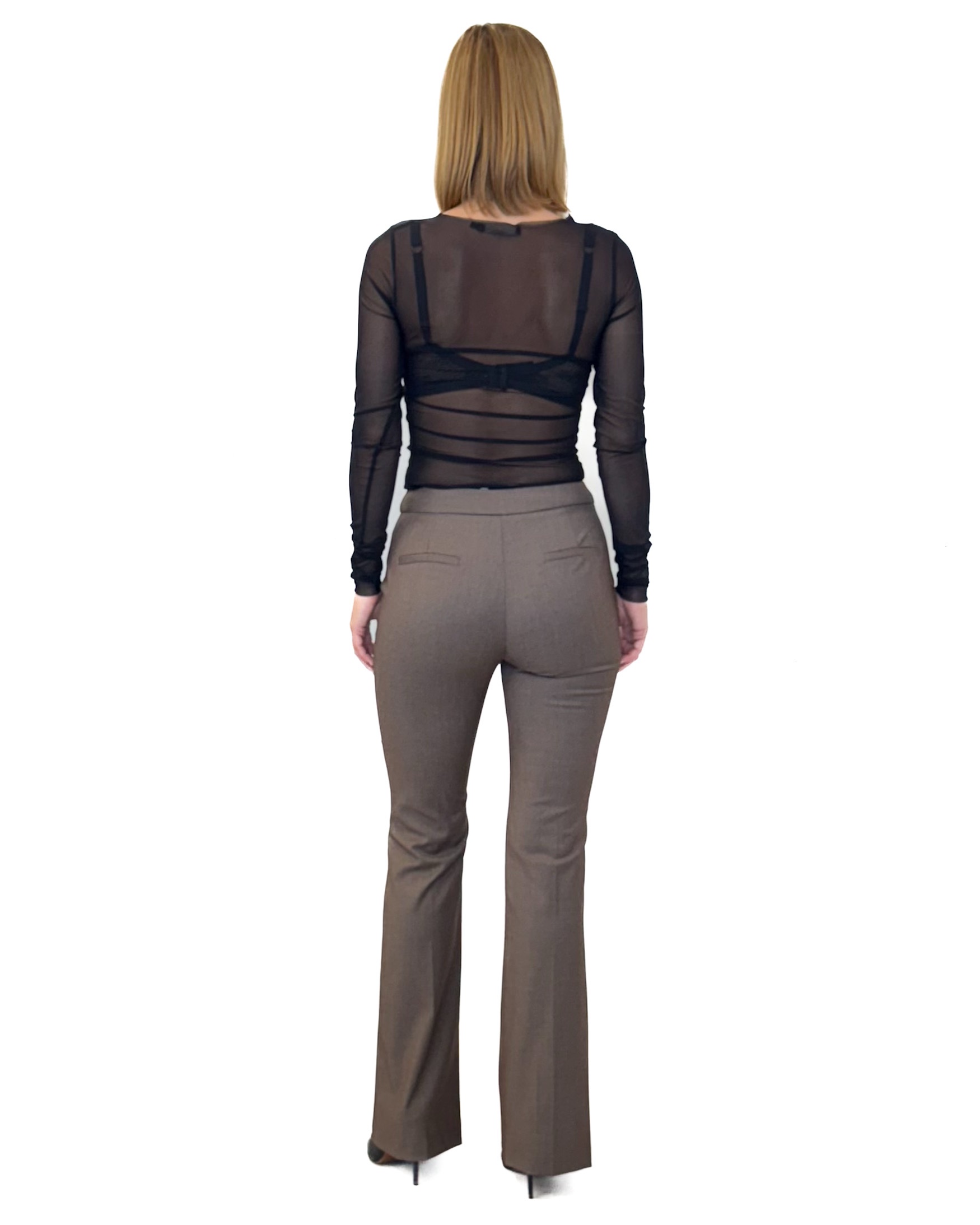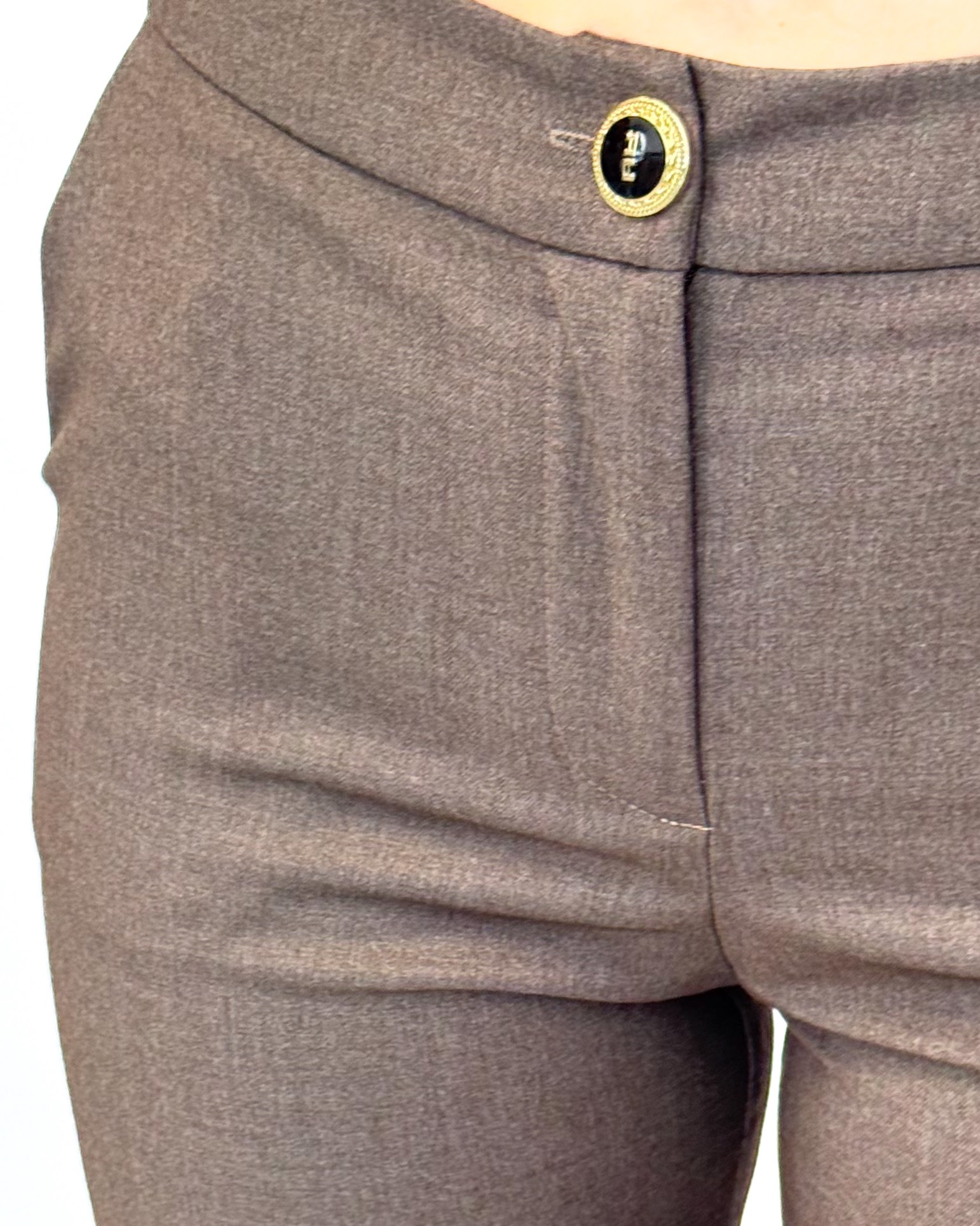 Czekoladowe spodnie materiałowe z rozszerzaną nogawką typu dzwony. Wygodne, stylowe i zapinane na złoty logowany guzik. Idealne do jesiennych stylizacji.