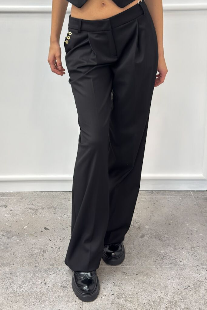 Opis: Luźne nogawki, ozdobne złote kółka przy prawej kieszeni