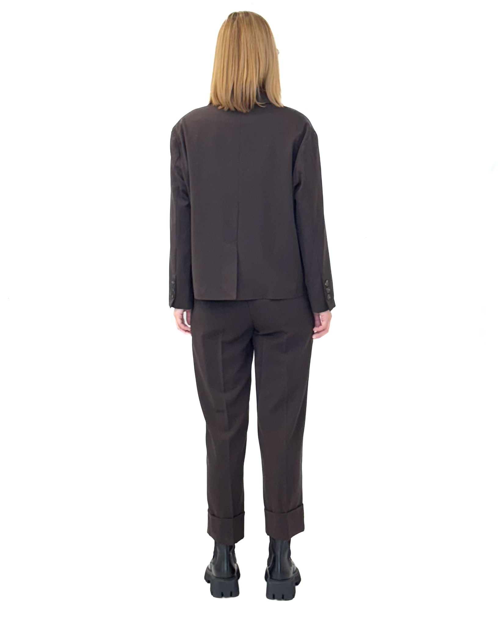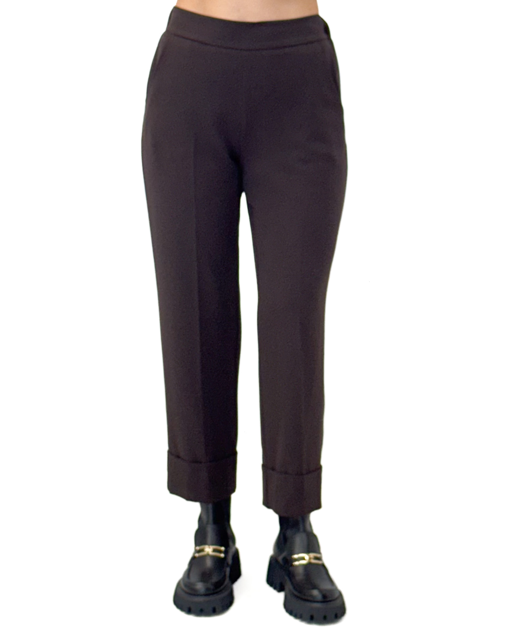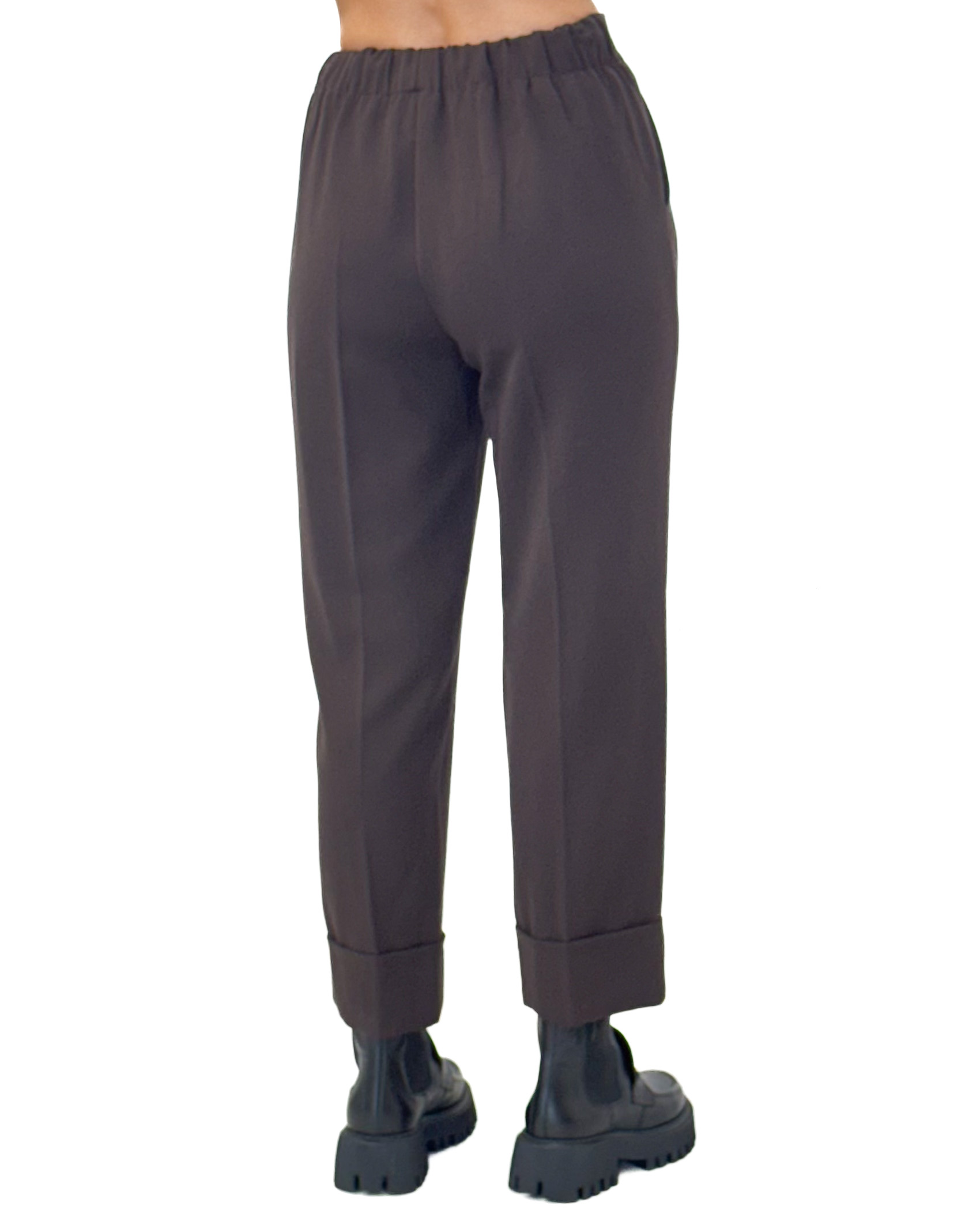 Czekoladowe spodnie z gumką w pasie, mankietami na nogawkach i prostą nogawką z kantem to niezwykle uniwersalny element garderoby, który łatwo dopasować do różnych stylizacji.