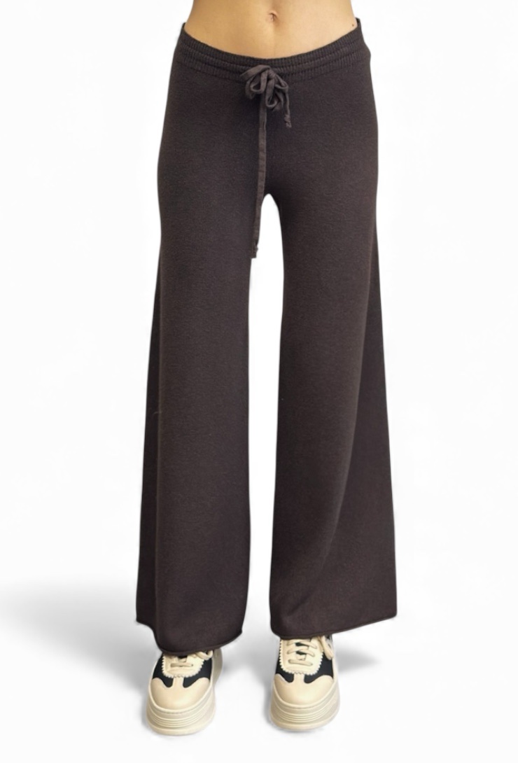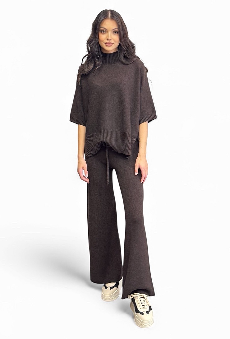 Czekoladowy komplet z dzianiny – luźne spodnie i sweter z delikatnym golfem oraz rękawem do łokcia. Stylowy i kobiecy – idealny na codzień i do pracy.