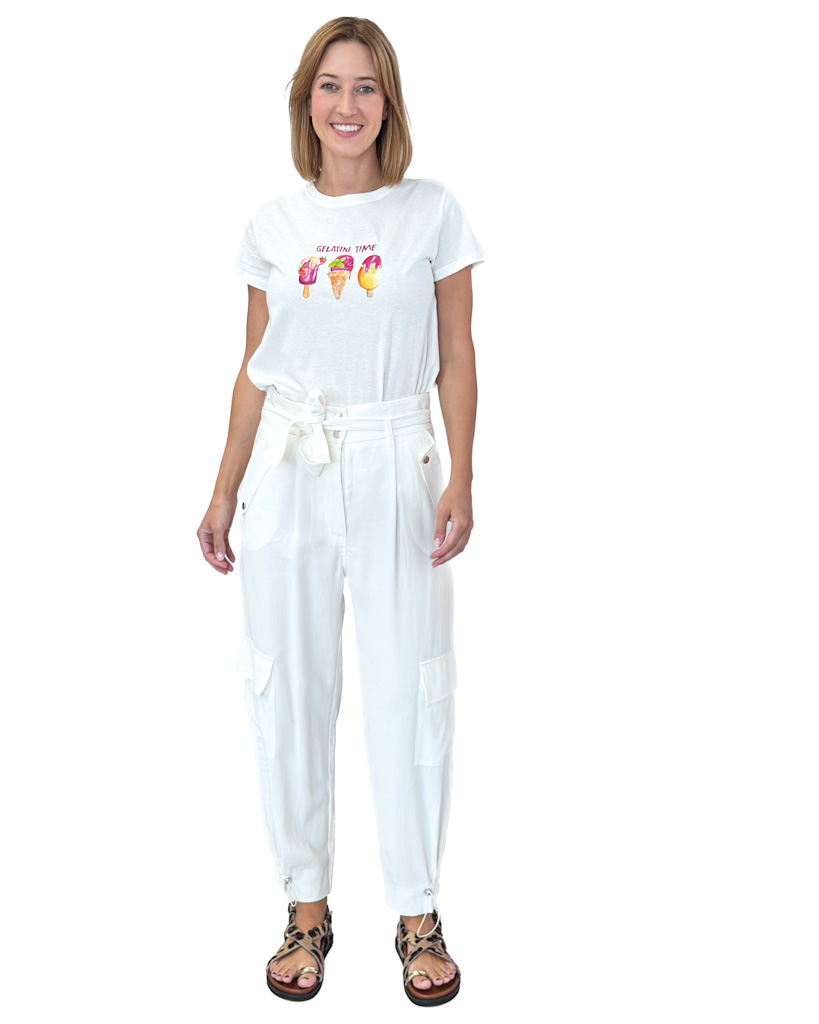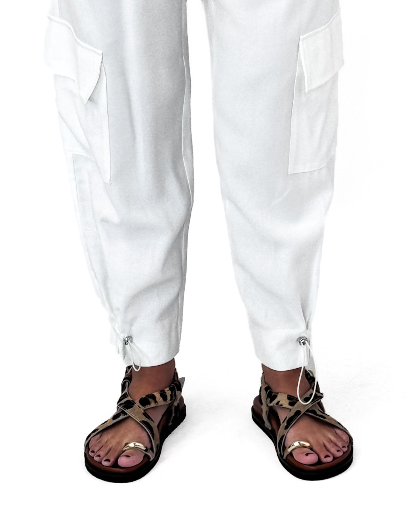 Opis spodni: Nogawka zwężana ku dołowi, wyższy stan, wiązane w pasie, kieszenie na nogawkach