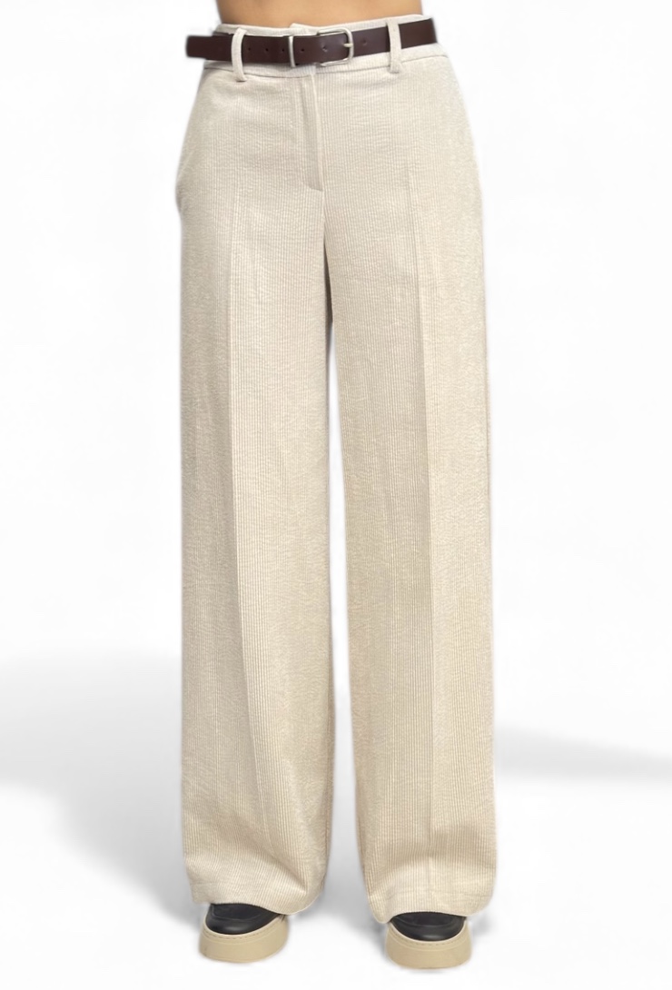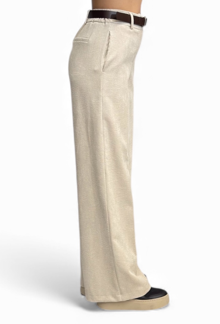 Damskie kremowe spodnie z miękkiego sztruksu marki Pia B. Szeroka nogawka, wygodny krój i modna prążkowana struktura materiału. Idealne na co dzień!