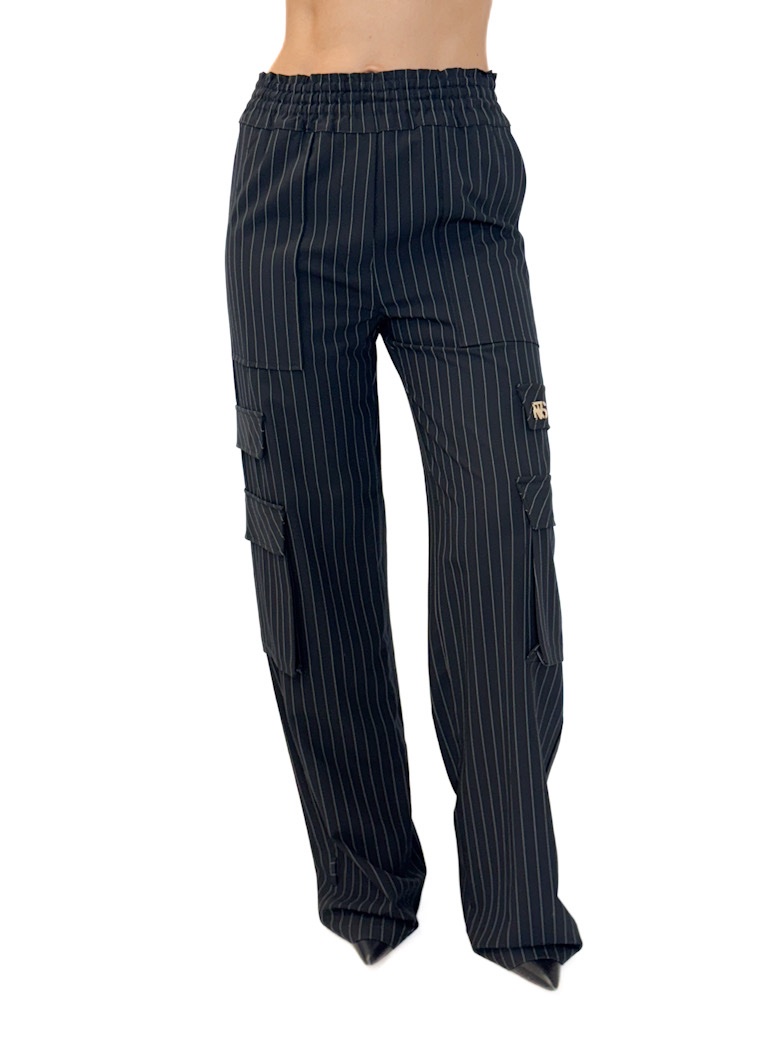 Opis: Proste szerokie nogawki, print w pionowy prążek, kieszenie po bokach, złota blaszka z logo marki, dół nogawki zawiązywany, ściągacz w pasie
