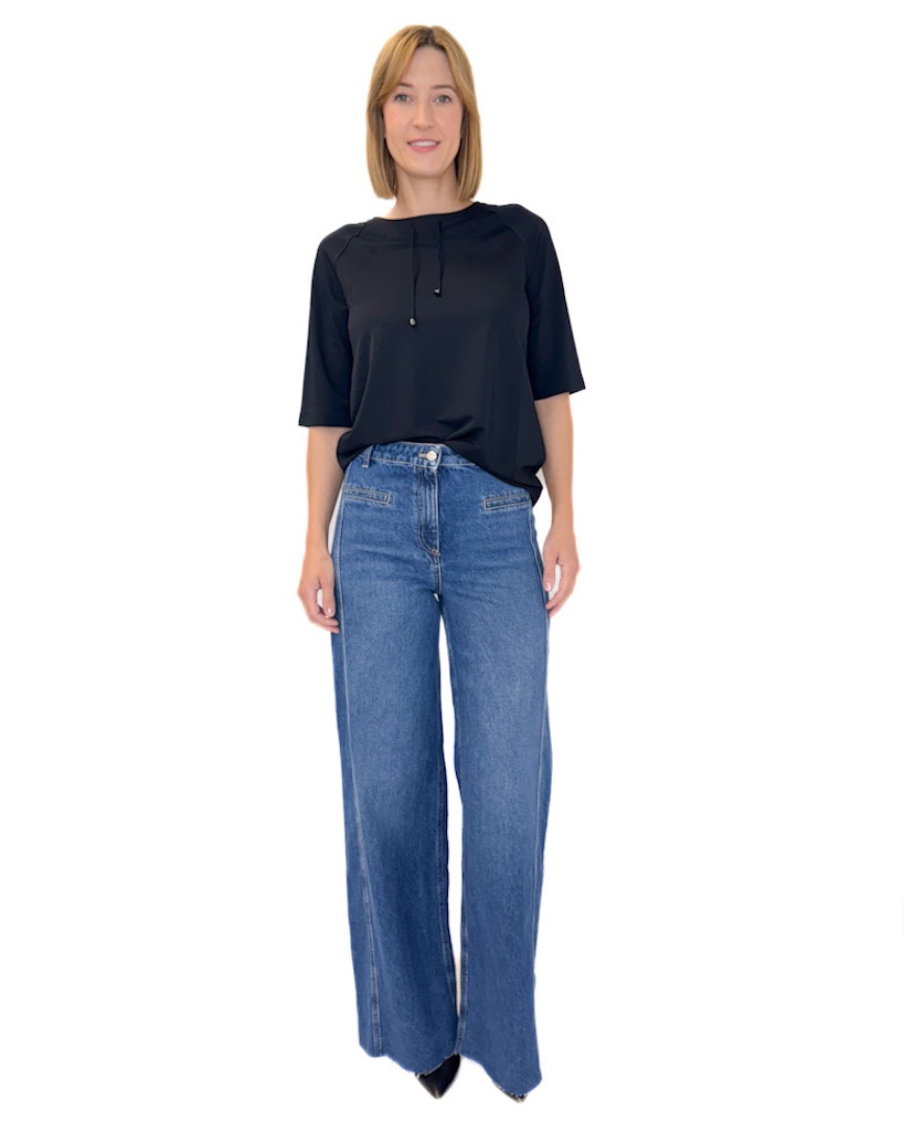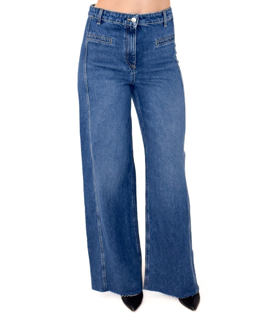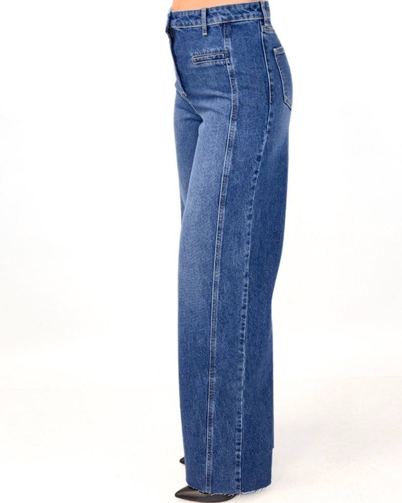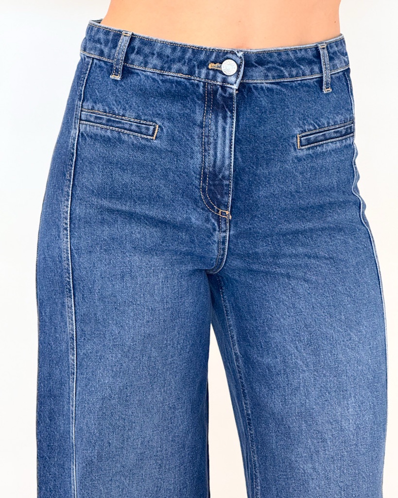 Stylowe, niebieskie jeansy z szeroką nogawką i wysokim stanem, obszyte brązową nitką z pionowymi przeszyciami – klasyka w nowoczesnym wydaniu.
