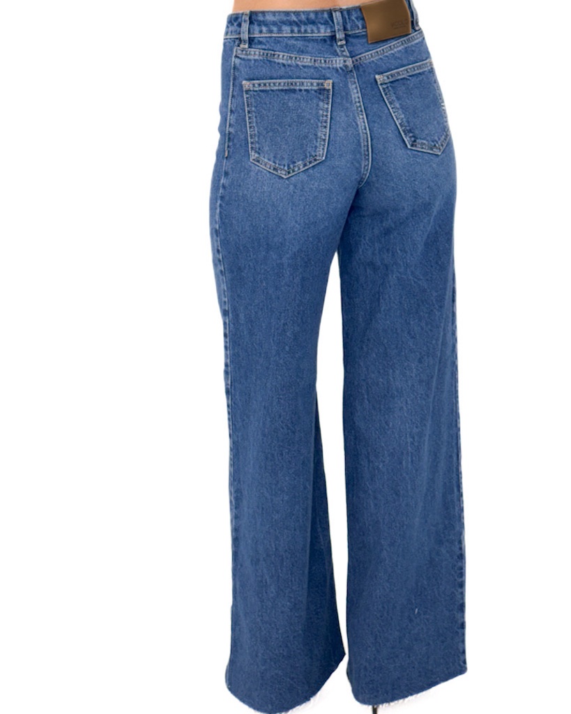 Niebieskie jeansy z szeroką nogawką i wysokim stanem to must-have w garderobie każdej kobiety ceniącej wygodę, modny wygląd i ponadczasowy styl. Wykonane z wysokiej jakości, trwałego denimu, zapewniają idealne dopasowanie w talii oraz swobodę ruchów w nogawkach. Klasyczny, głęboki odcień niebieskiego sprawia, że spodnie są uniwersalne i łatwe do łączenia z różnymi elementami garderoby – od eleganckich koszul, po luźne T-shirty.