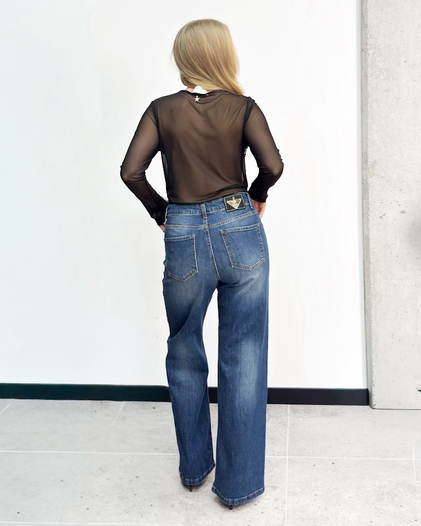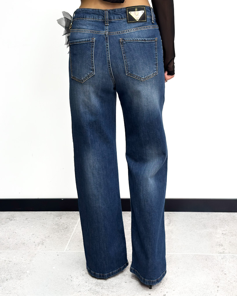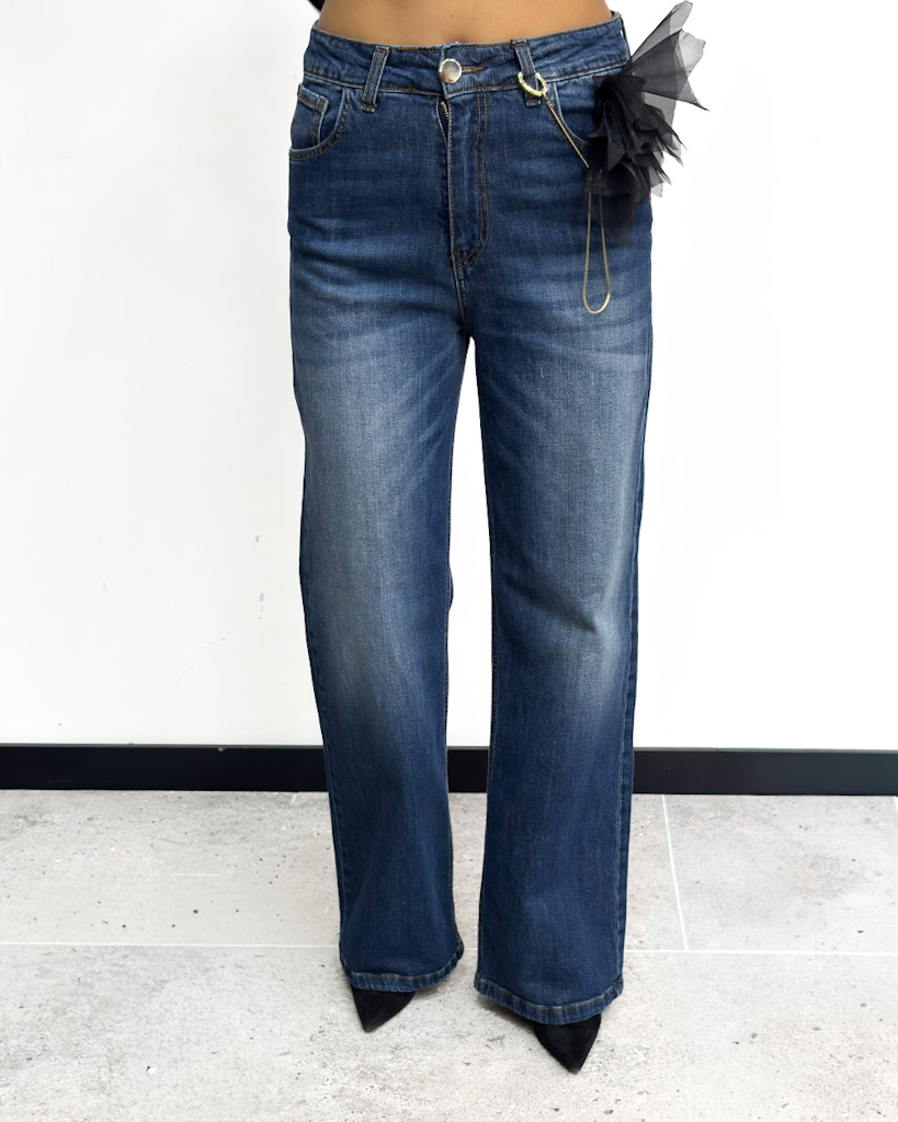 Spodnie jeansy granatowe Babylon o prostym kroju z przetarciami, czarną tiulową aplikacją i złotymi łańcuszkami. Styl glamour w codziennym wydaniu!