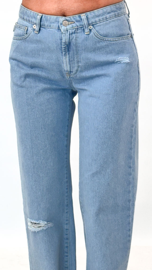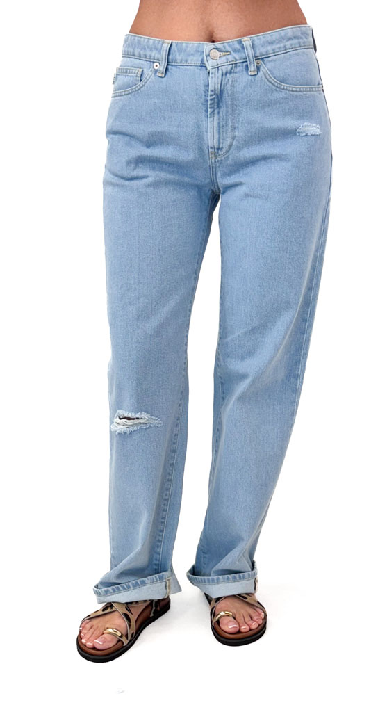 Jasne jeansy z prostą nogawką i subtelnym przetarciem. Stylowy, klasyczny fason na co dzień. Idealne do T-shirtu, bluzy lub marynarki!