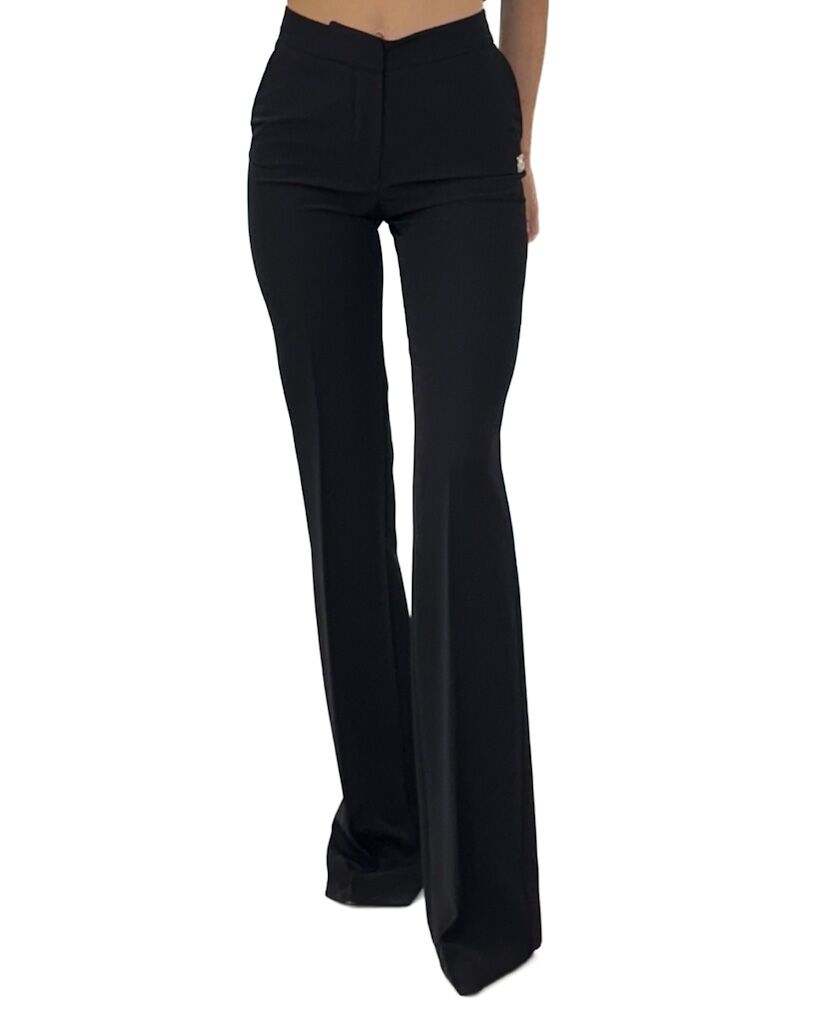 Opis: Góra dopasowana, nogawka rozszerzana, posiadają kieszenie, przy lewej kieszonce blaszka z logo marki, zapinane na suwak i haftkę