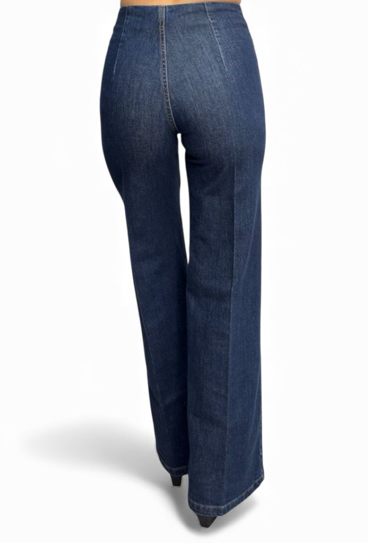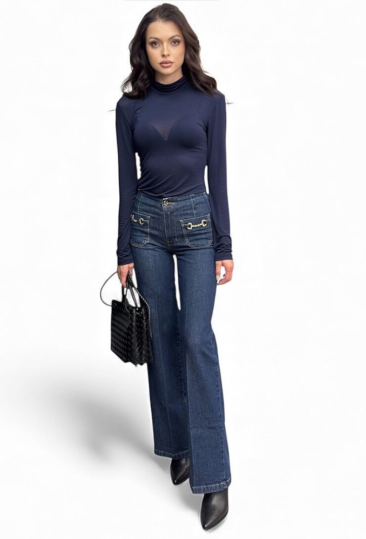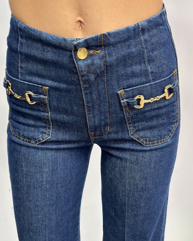 *** Postaw na klasykę, która zawsze wygląda perfekcyjnie. Granatowe jeansy ze złotym akcentem to must have w Twojej garderobie – zamów już dziś!