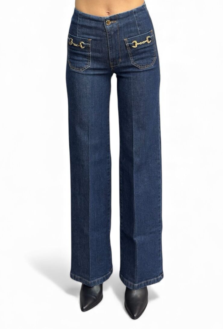 Opis:Długa, prosta nogawka, dwie kieszenie z przodu ze złotym łańcuszkiem
