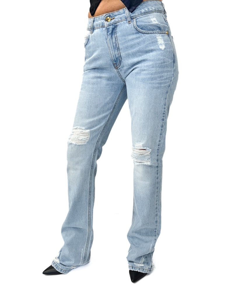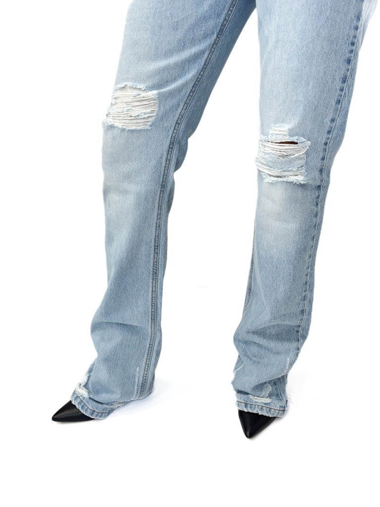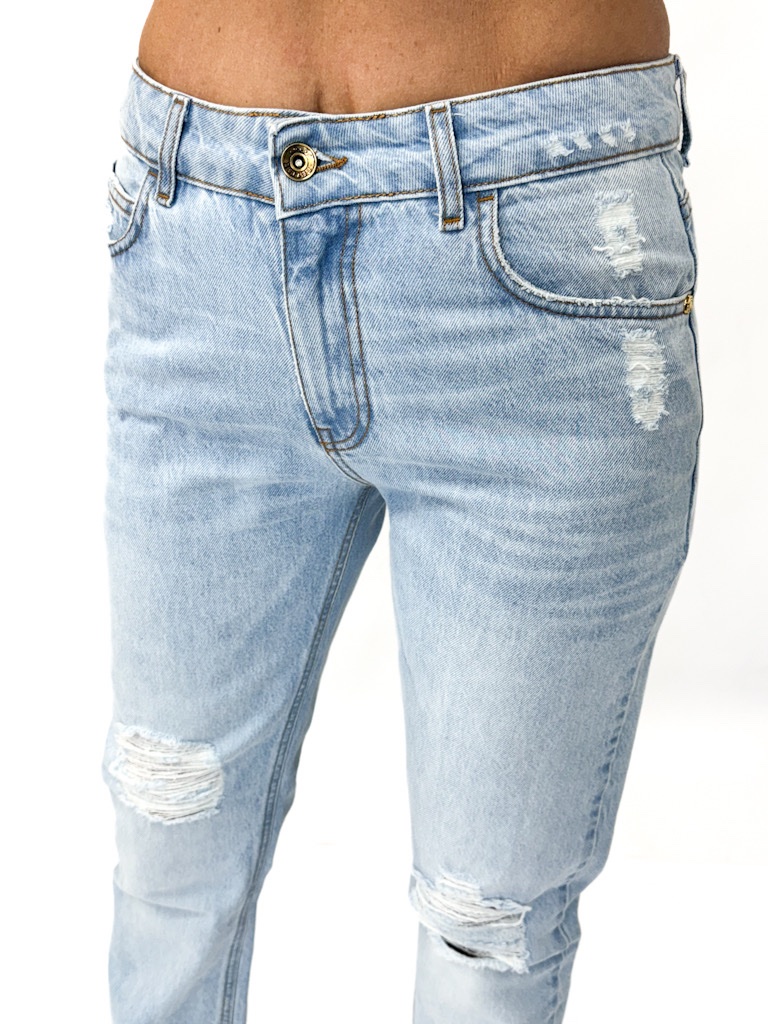 Klasyczne jeansy damskie w odcieniu jasnego denimu z modnymi przetarciami na nogawkach. Wysoki stan, prosty fason i elastyczny materiał gwarantują wygodę noszenia i świetne dopasowanie do sylwetki. Stylowe rozdarcia na kolanach dodają miejskiego charakteru i sprawiają, że to idealna propozycja na co dzień – do sneakersów, mokasynów, a nawet szpilek.