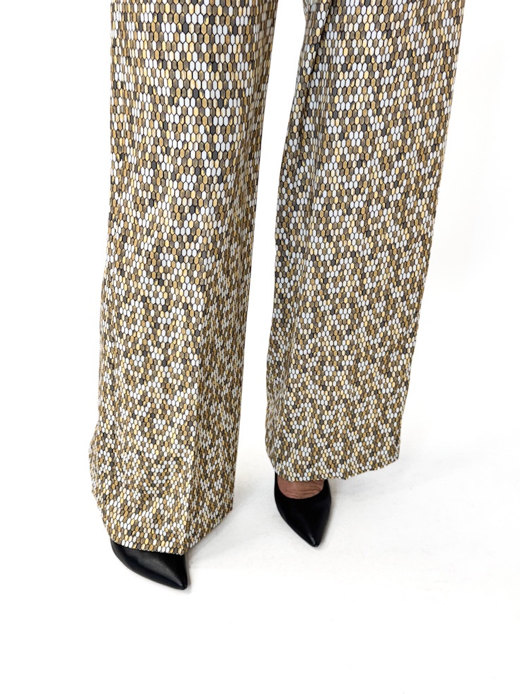 Opis: Print w złoto-beżowym kolorze, ozdobny guzik w pasie ale złota blaszka z logo marki, stan wysoki, nogawka szeroka