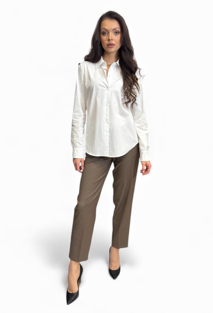 Klasyczny krój cygaretek sprawia, że spodnie są uniwersalne – doskonale komponują się zarówno z elegancką koszulą i żakietem do biura, jak i z casualową bluzką czy topem na mniej formalne okazje. Neutralny kolor taupe pozwala na łatwe zestawienie z innymi elementami garderoby, co czyni je praktycznym i stylowym wyborem na każdą porę roku.