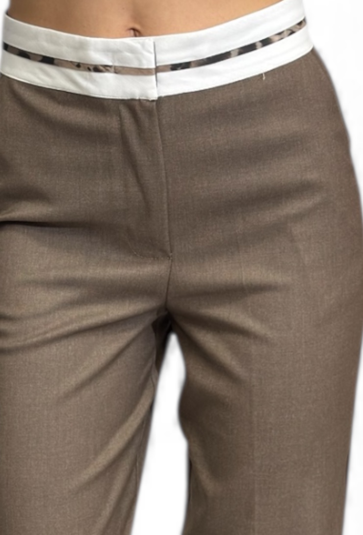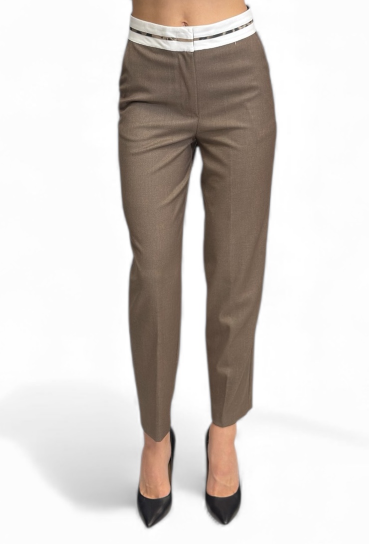 Klasyczne spodnie z materiału, cygaretki taupe od marki Pia B. Klasyczny fason, ozdobny pas w najmodniejszym kolorze sezonu Jesień/Zima 2025!