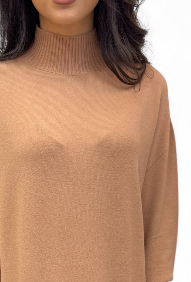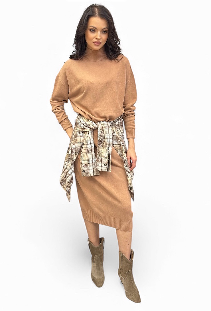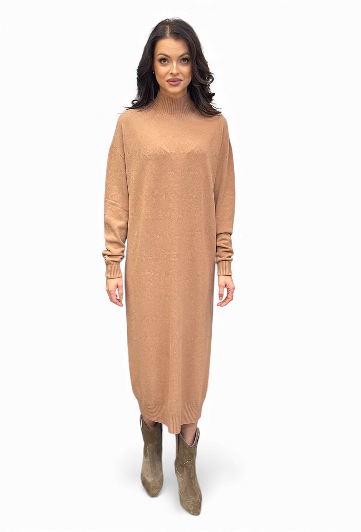 Beżowa sukienka dzianinowa midi z półgolfem od marki Kontatto. Wygodna, ciepła i elegancka – idealna na co dzień i do pracy. Maksymalny komfort noszenia.