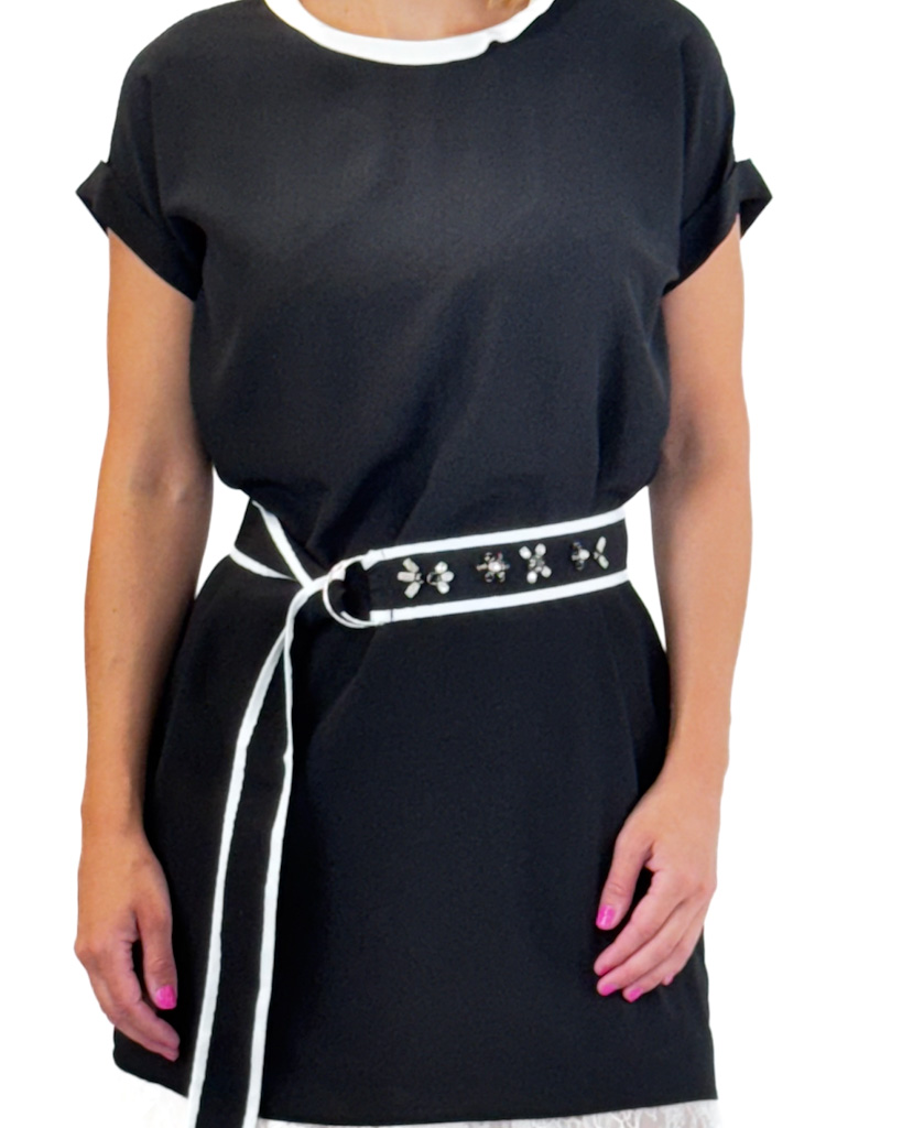 *** Podkreśl swój wyjątkowy styl i poczuj się zjawiskowo. Wybierz czarną sukienkę midi z koronkową halką i ozdobnym paskiem — dodaj swojej garderobie nutę luksusu już dziś! ***