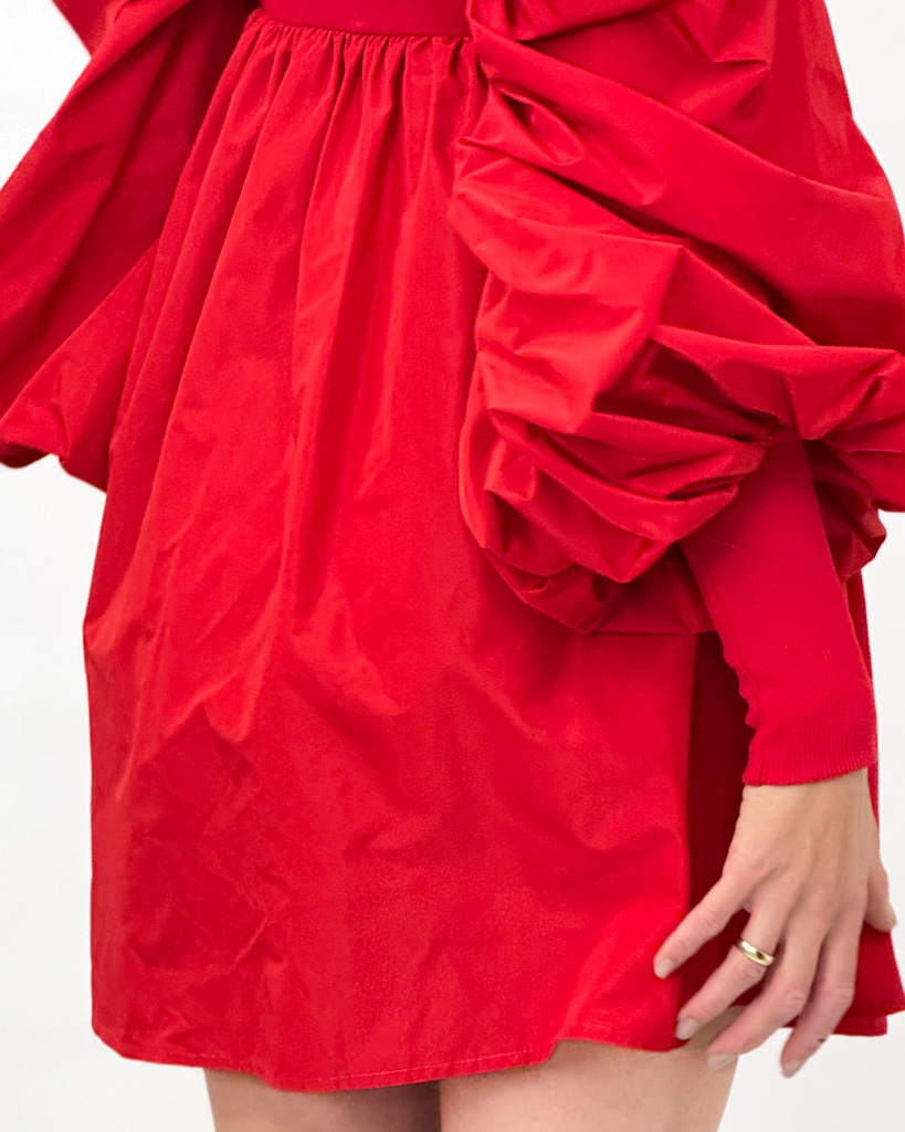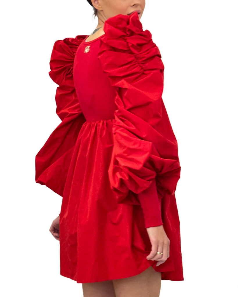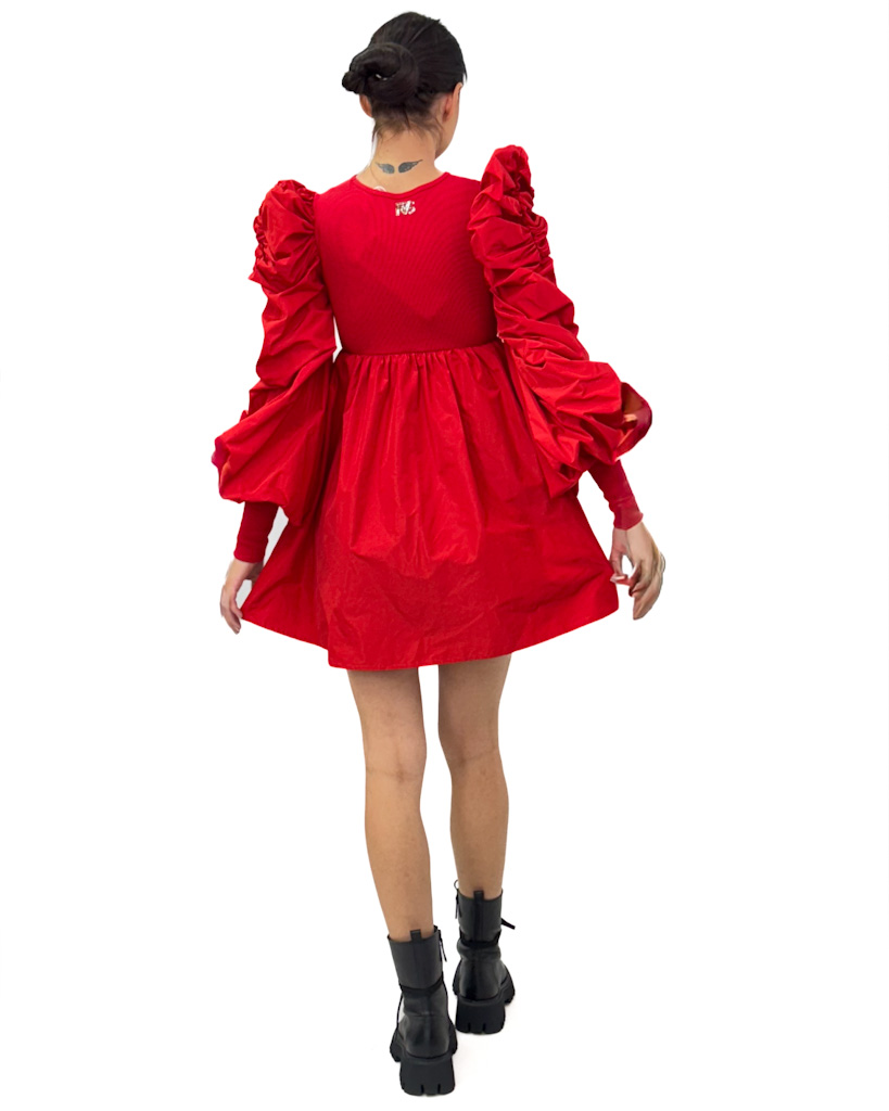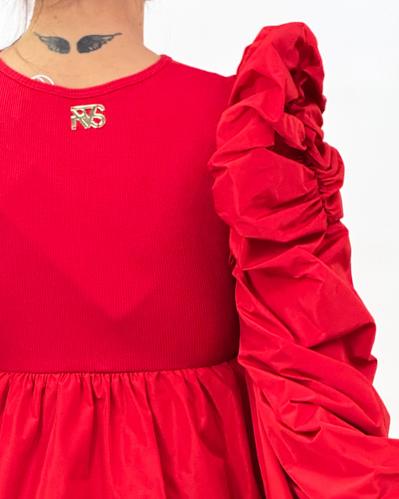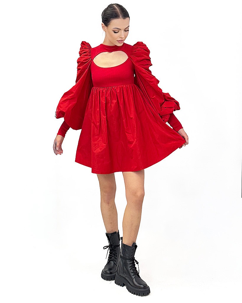 Czerwona, krótka sukienka z dopasowaną górą i rozkloszowanym dołem. Marszczone rękawy, wycięcie na karku i złota blaszka z logo marki – pełna elegancja!