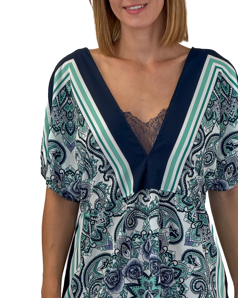 Opis:Dekolt w szpic ozdobiony koronką, na plecach blaszka z logo marki w kształcie serca, luźny fason