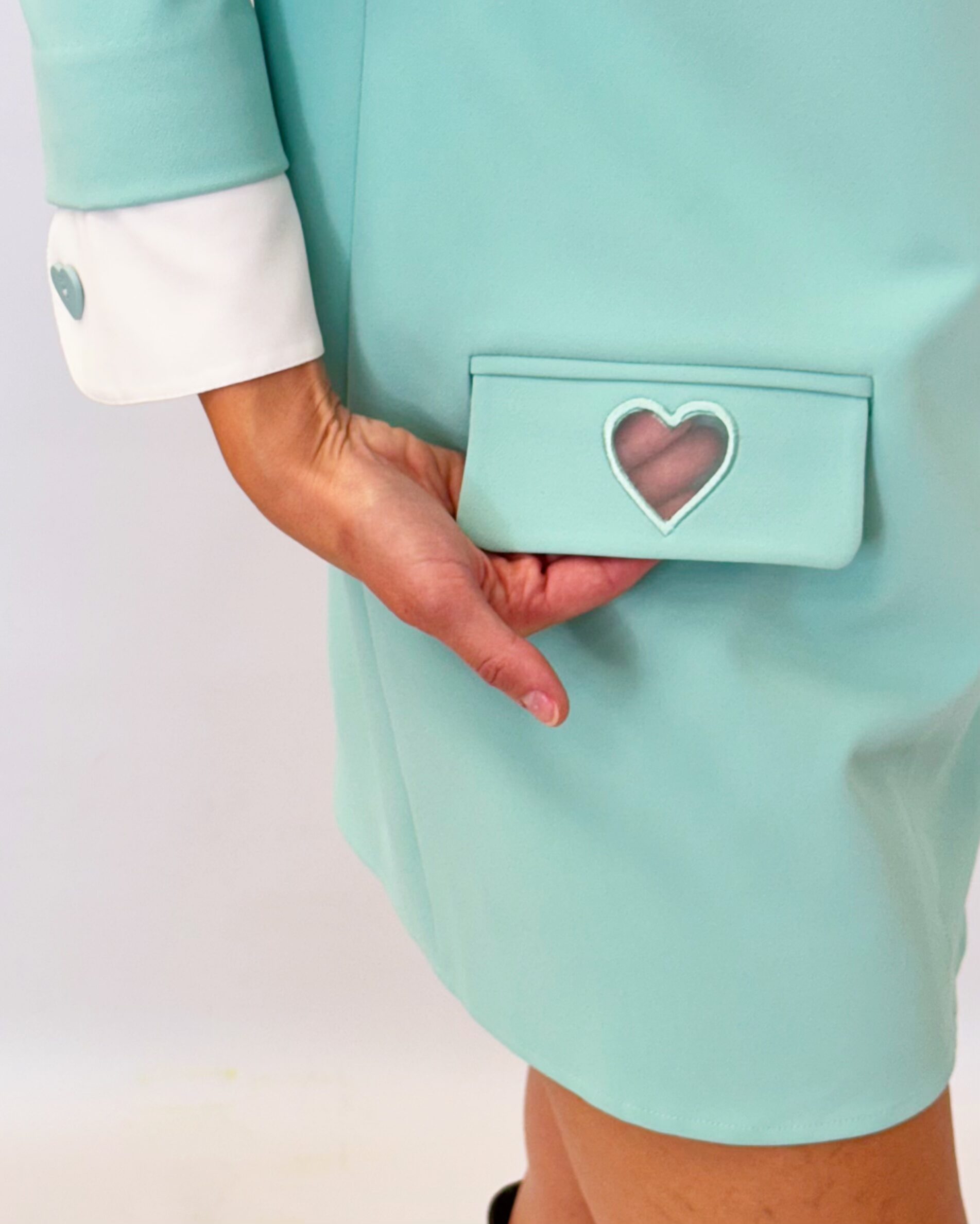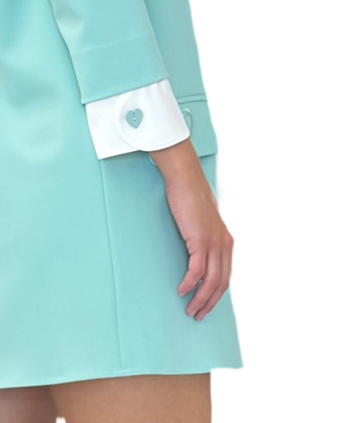 Turkusowa, mini sukienka Elisabetta Franchi z kremowymi mankietami i sercowymi detalami. Elegancki model idealny na wyjątkowe okazje – bankiety, wesela, wielka wyjścia!