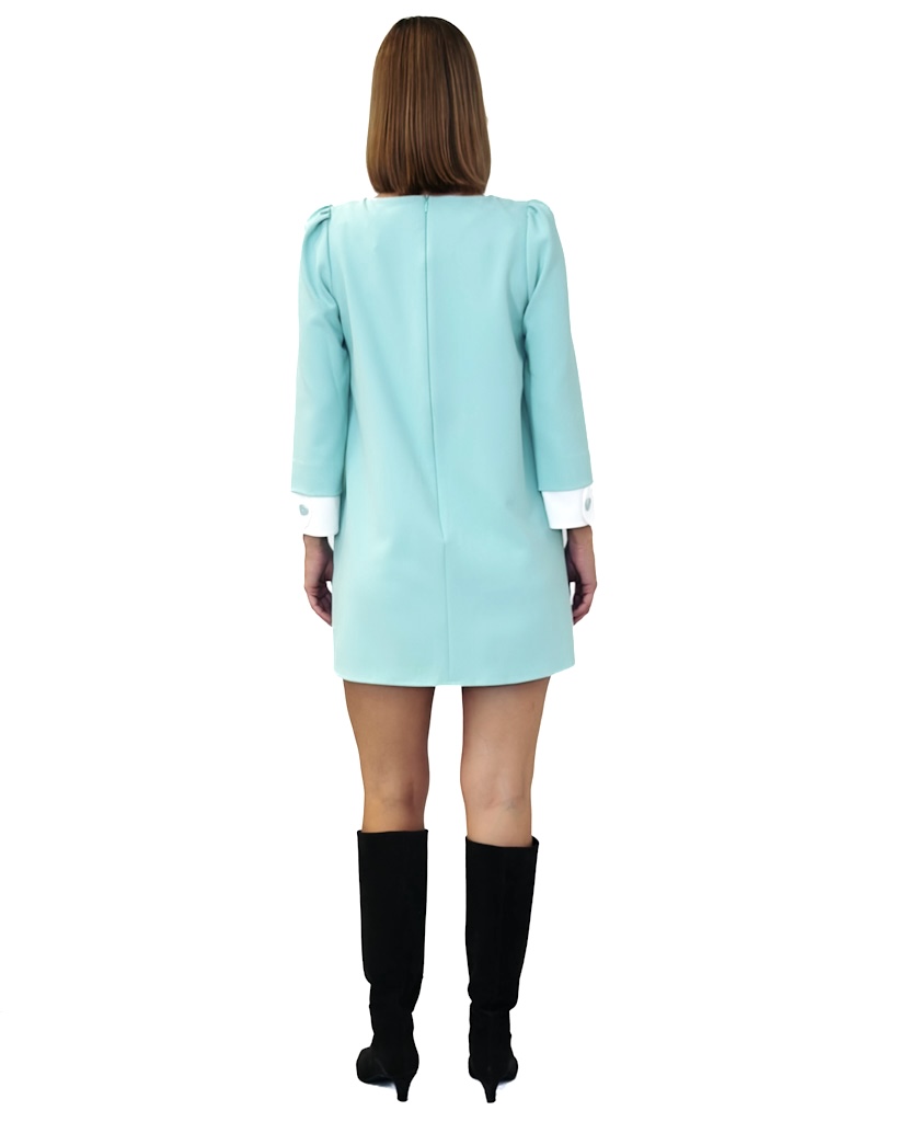 Sukienka zapinana jest na suwak umieszczony z tyłu, co gwarantuje wygodę noszenia i idealne dopasowanie do sylwetki. Jej mini długość subtelnie eksponuje nogi, a wyrazisty turkusowy kolor przyciąga spojrzenia, tworząc look pełen świeżości i klasy.