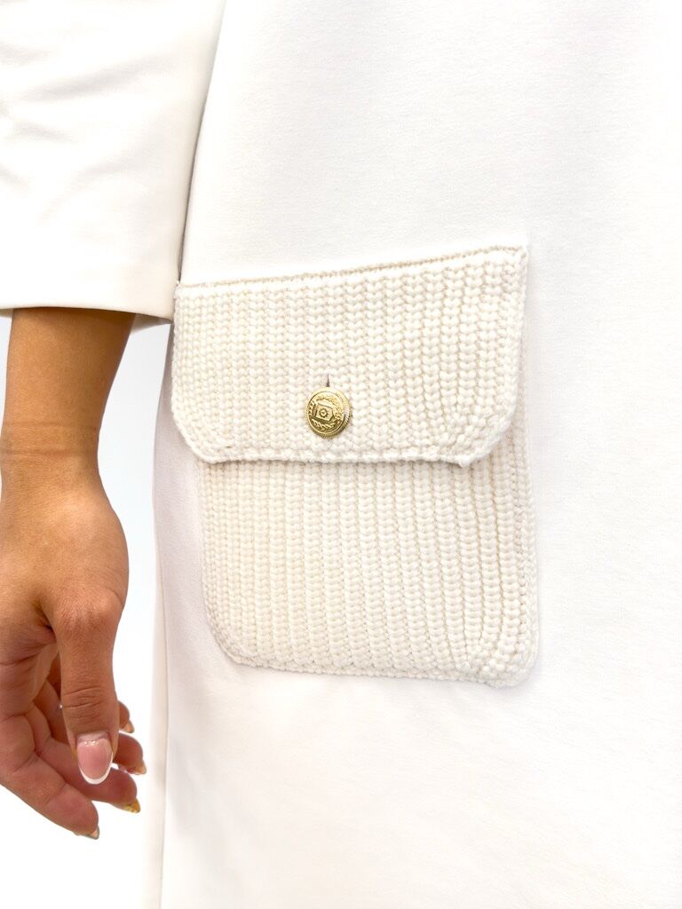 Opis: Rękaw za łokieć, długość do kolan, dekolt okrągły obszyty ściągaczem , ozdobna pleciona kieszonka oraz złoty guzik, materiał gładki, fason luźny