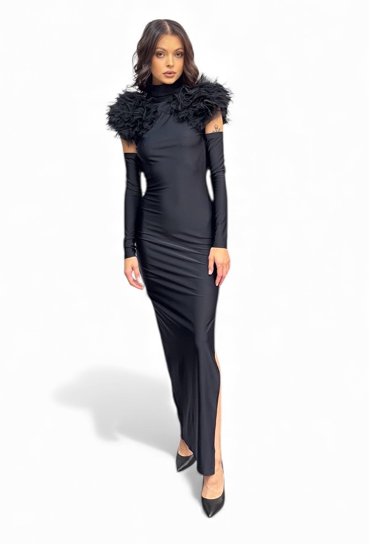 *** Zachwyć wszystkich! Długa czarna sukienka z wycięciami i tiulowymi aplikacjami to połączenie elegancji i odważnego stylu. Stwórz niezapomniany look i poczuj się wyjątkowo – zamów już dziś!