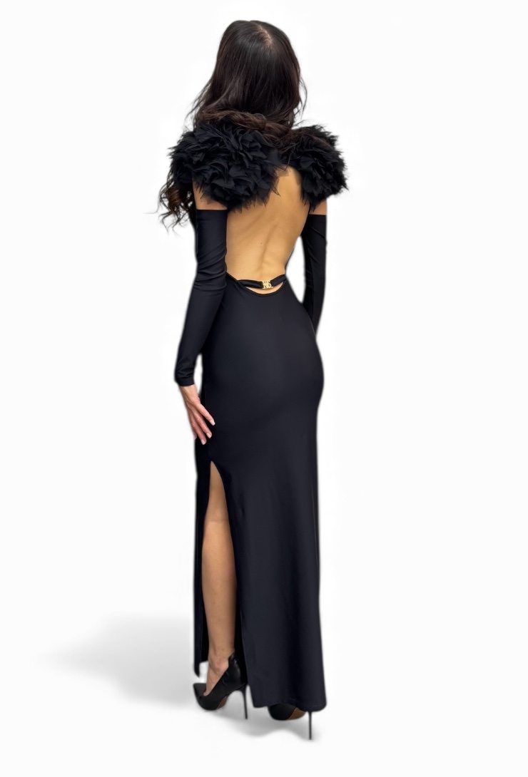 Długa, czarna, elegancka sukienka z efektownymi wycięciami na plecach i rękach, tiulową aplikacją na ramionach i rozcięciem na nogę. Na wyjątkowe okazje!