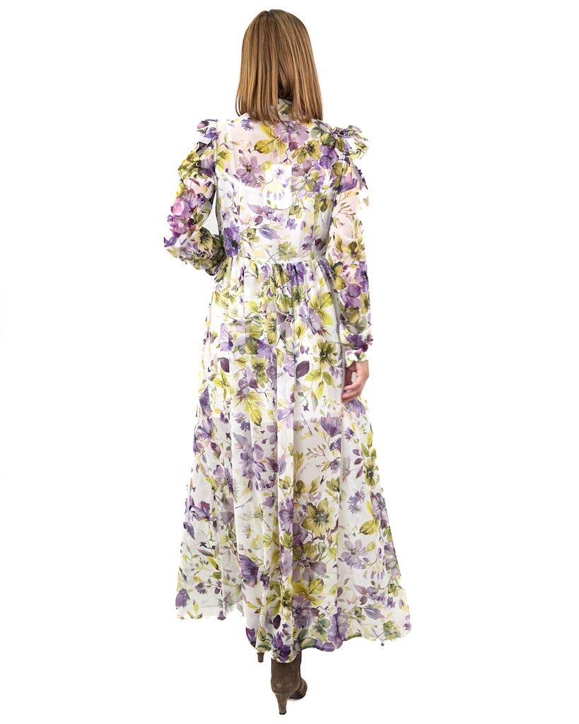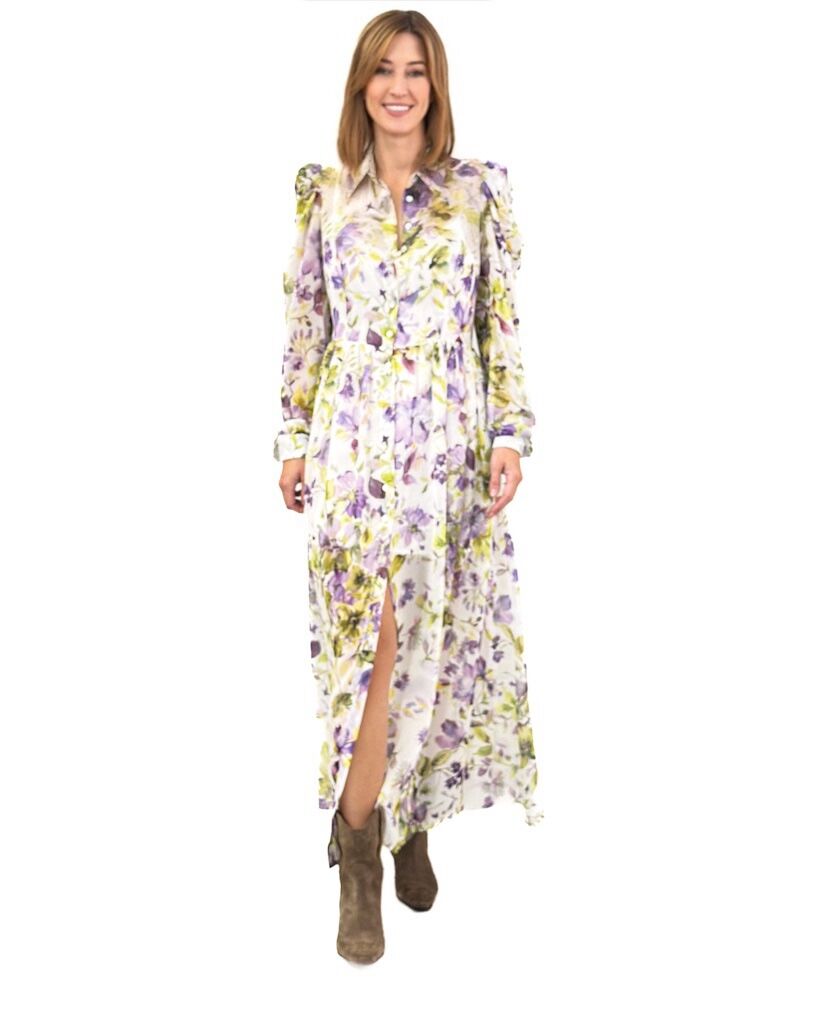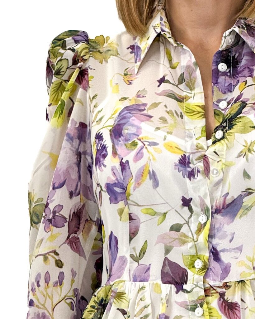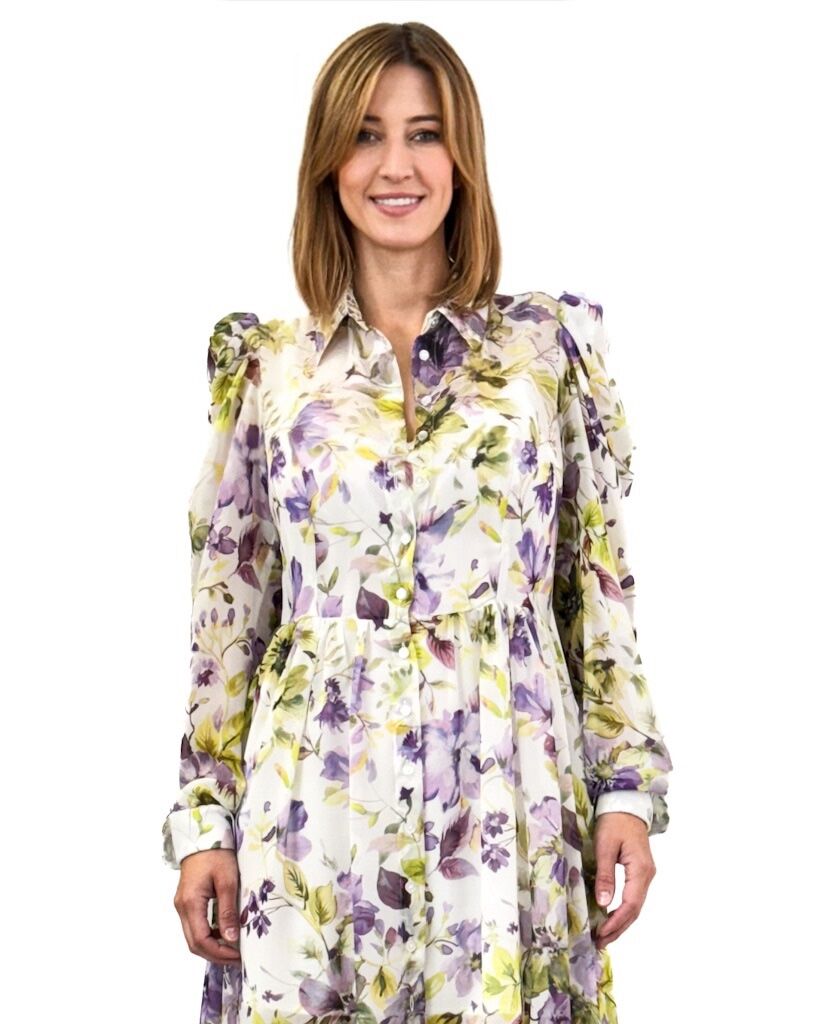 Opis: Print w kwiaty, długi fason, w pasie odcięta, zapinana na guziki, rękaw długi zakończony mankietem, posiada kołnierzyk, posiada podszewkę na ramiączkach