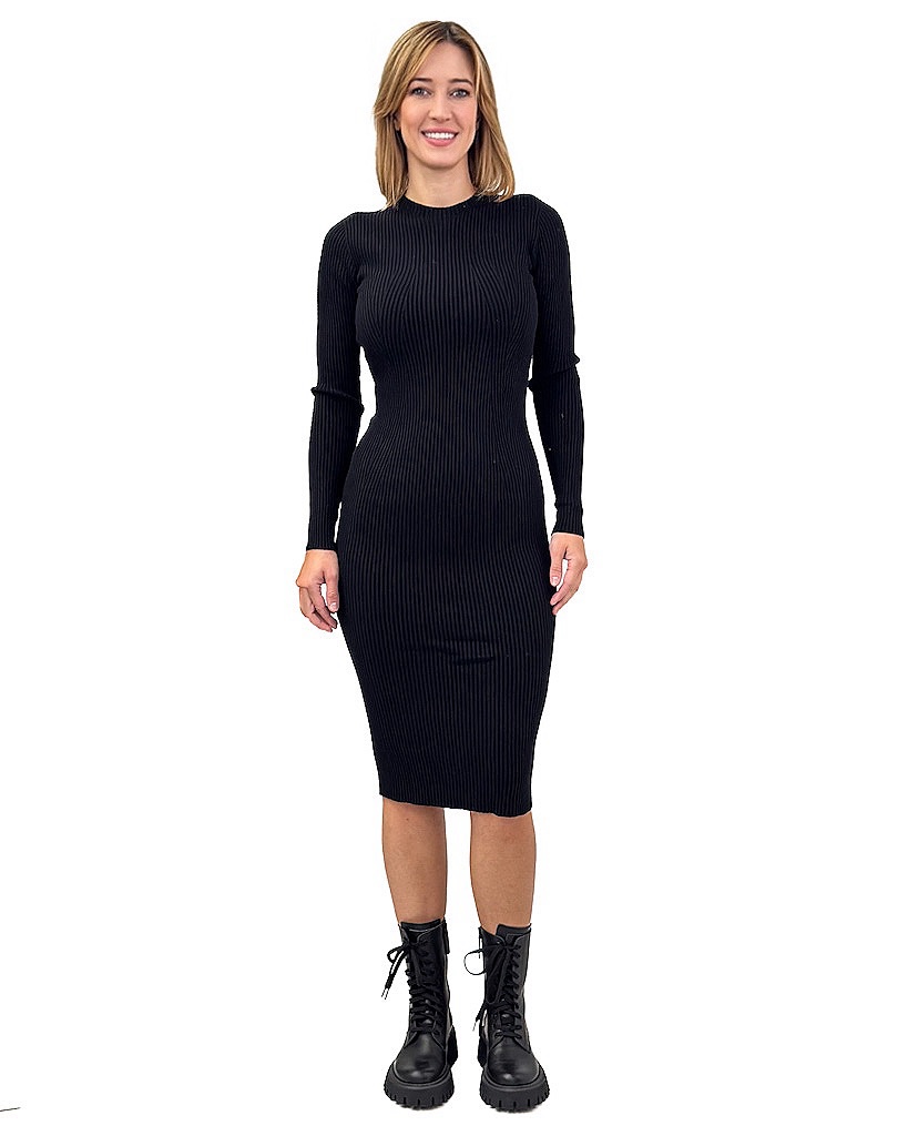 Sukienka z dzianiny czarna o dopasowanym fasonie oraz długim rękawem wykonana z elastycznego materiału w prążek to kwintesencja kobiecego minimalizmu i ponadczasowego stylu. Prążkowana dzianina pięknie podkreśla sylwetkę, a klasyczny czarny kolor sprawia, że łatwo dopasujesz ją do różnych okazji – od codziennych stylizacji po wieczorne wyjścia.