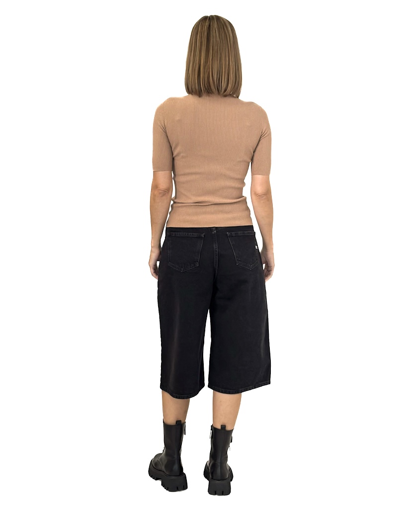 Camelowy golf z krótkim rękawem w pionowy prążek to idealne połączenie elegancji, wygody i ponadczasowego stylu. Wykonany z miękkiego, przyjemnego w dotyku materiału, doskonale dopasowuje się do sylwetki, podkreślając jej atuty. Pionowy prążek dodaje subtelnej struktury i wydłuża optycznie sylwetkę, a krótkie rękawy sprawiają, że golf jest lekki i uniwersalny – idealny do codziennych stylizacji wiosną, latem lub pod marynarkę jesienią.