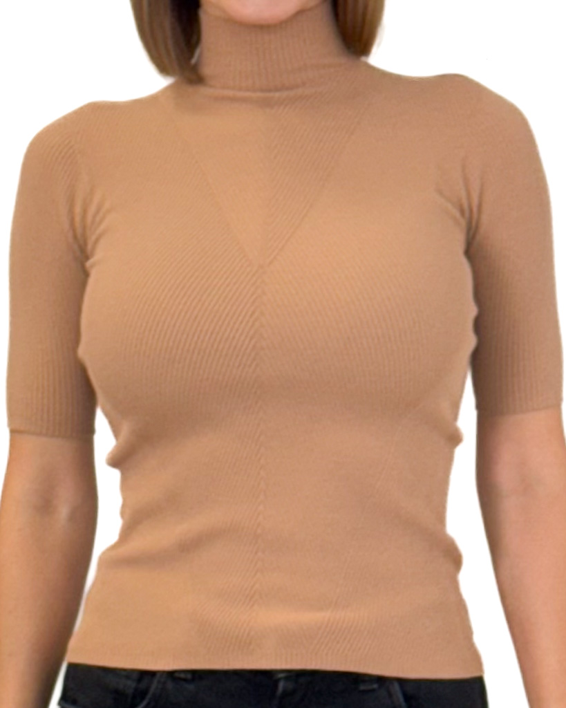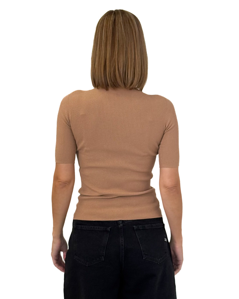 Damski, camelowy golf z krótkim rękawem o dopasowanym kroju. Miękki, przyjemny w dotyku materiał w prążek – stylowy i wygodny na każdą okazję.
