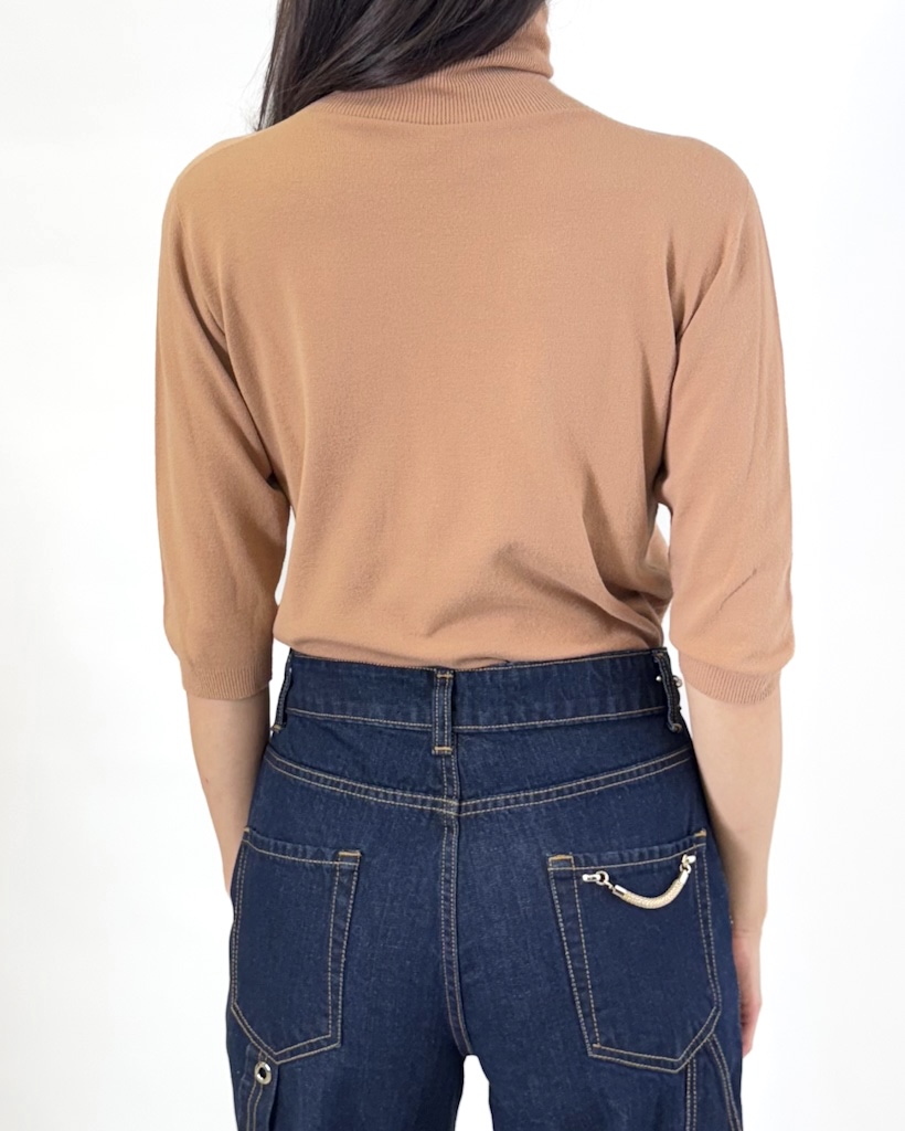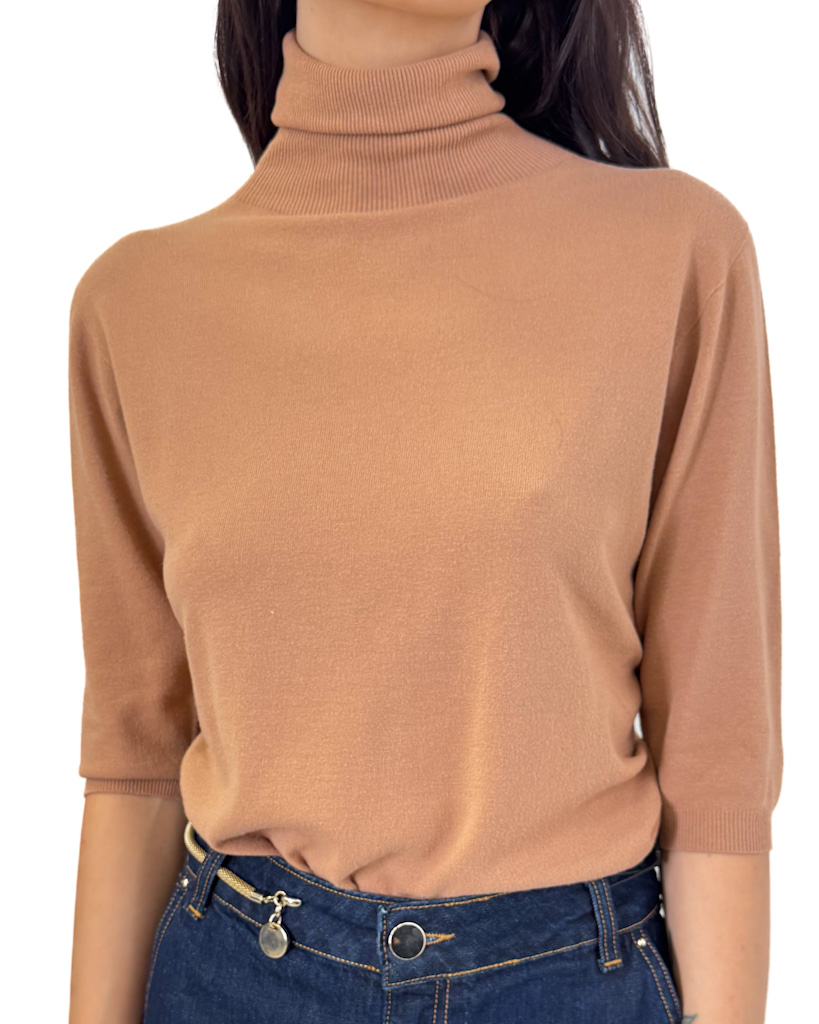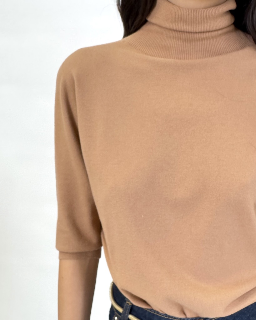Klasyczny camelowy odcień nadaje całości ponadczasowego charakteru – łatwo zestawisz go z jeansami, spódnicą ołówkową, eleganckimi spodniami czy marynarką. Golf z krótkim rękawem świetnie sprawdza się w okresie przejściowym, kiedy potrzebujesz czegoś lekkiego, a jednocześnie eleganckiego. Możesz nosić go samodzielnie w cieplejsze dni albo wykorzystać jako bazę pod żakiet czy kardigan.