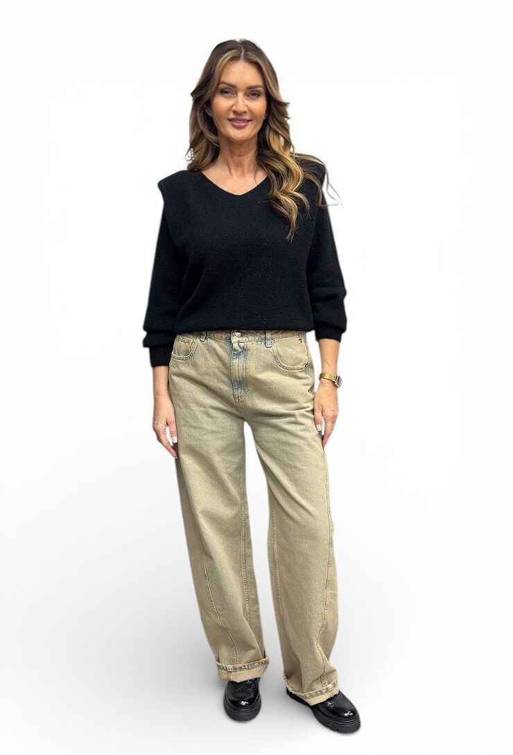 Klasyczny fason z dekoltem w kształcie litery V sprawia, że sweter pięknie układa się na sylwetce i pasuje do wielu stylizacji. Świetnie komponuje się zarówno z jeansami, jak i z eleganckimi spodniami czy spódnicą. Luźniejszy krój zapewnia komfort noszenia i swobodę ruchów, a jednocześnie podkreśla kobiecy charakter stylizacji.