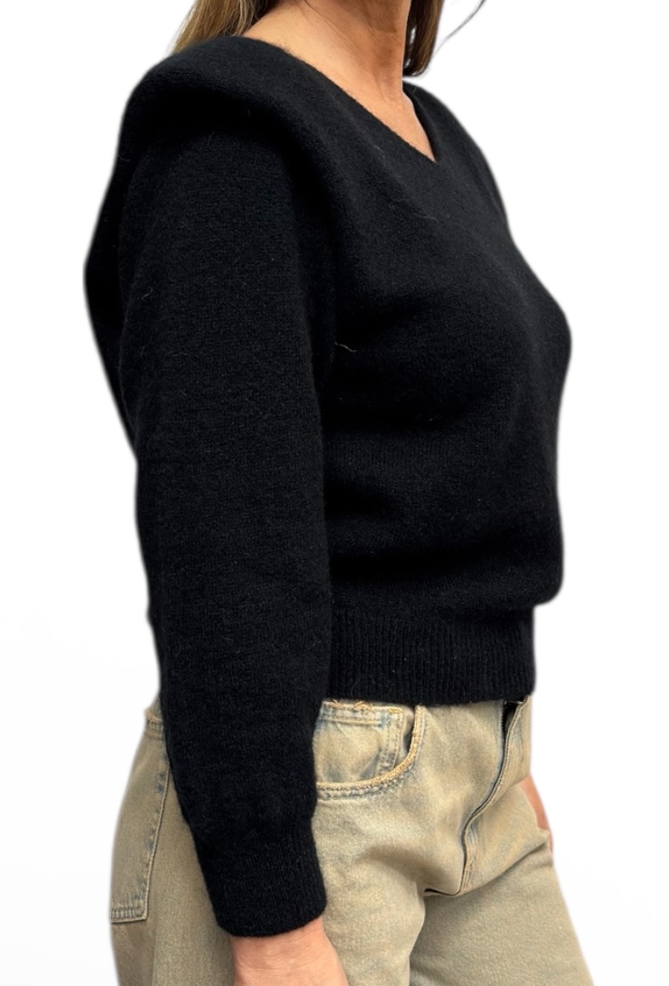 Czarny damski z wełną i moherem z dekoltem w szpic od marki Philialoft. Naturalny skład, miękkość, ciepło i ponadczasowy fason. Idealny na jesień i zimę.