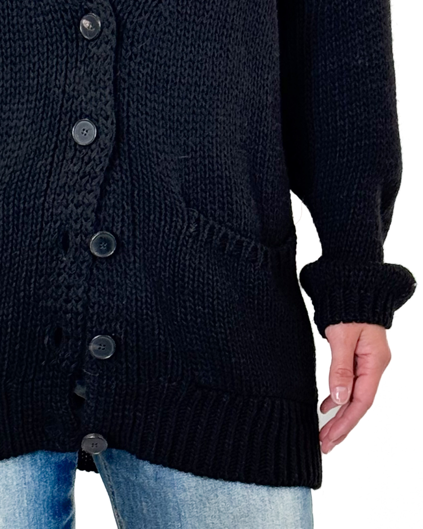 Czarny, damski kardigan do bioder, zapinany na guziki z kieszeniami. Klasyczny i wygodny – idealny do jeansów, sukienki czy do pracy od marki Vicolo!