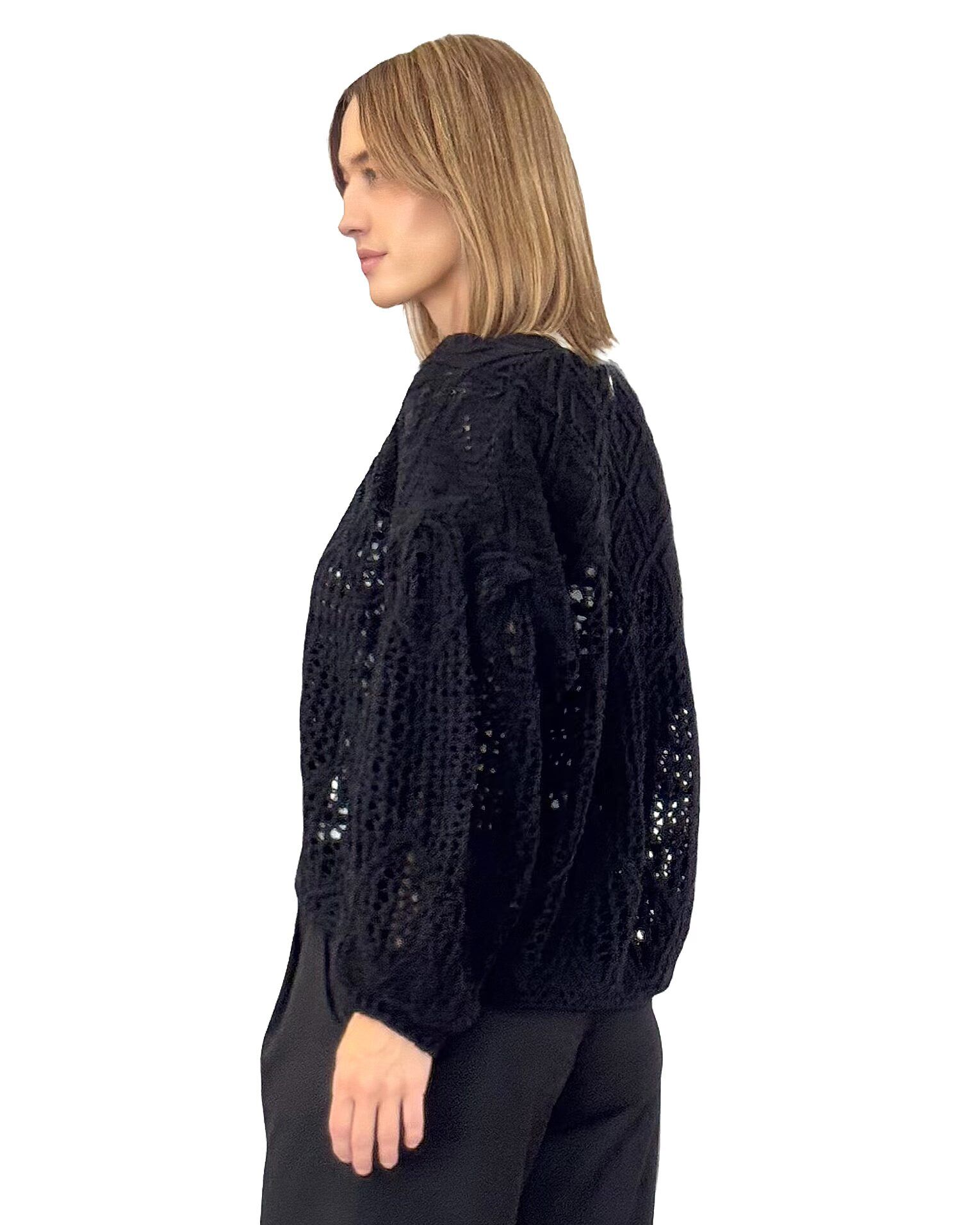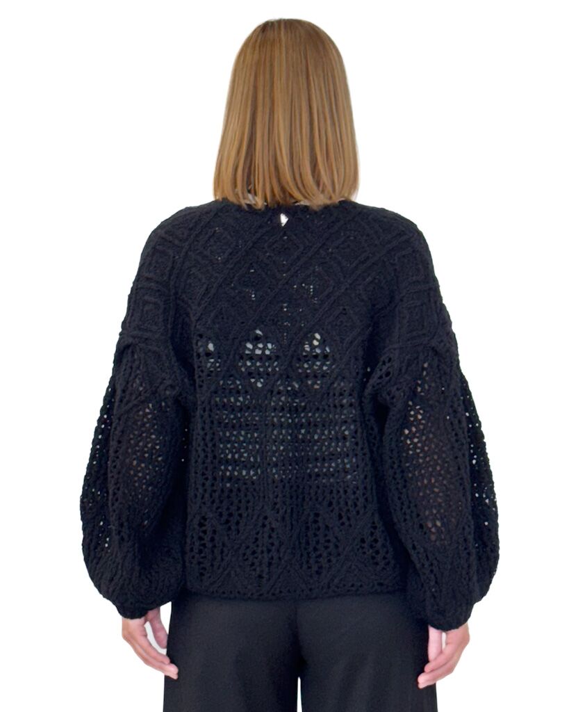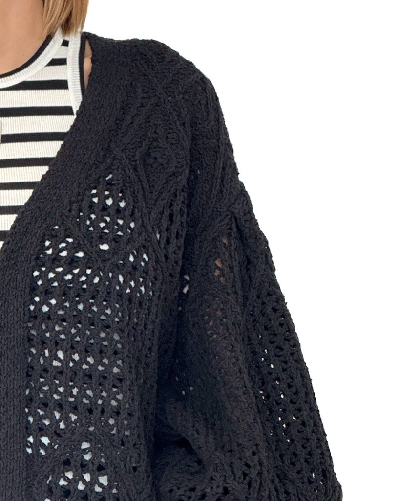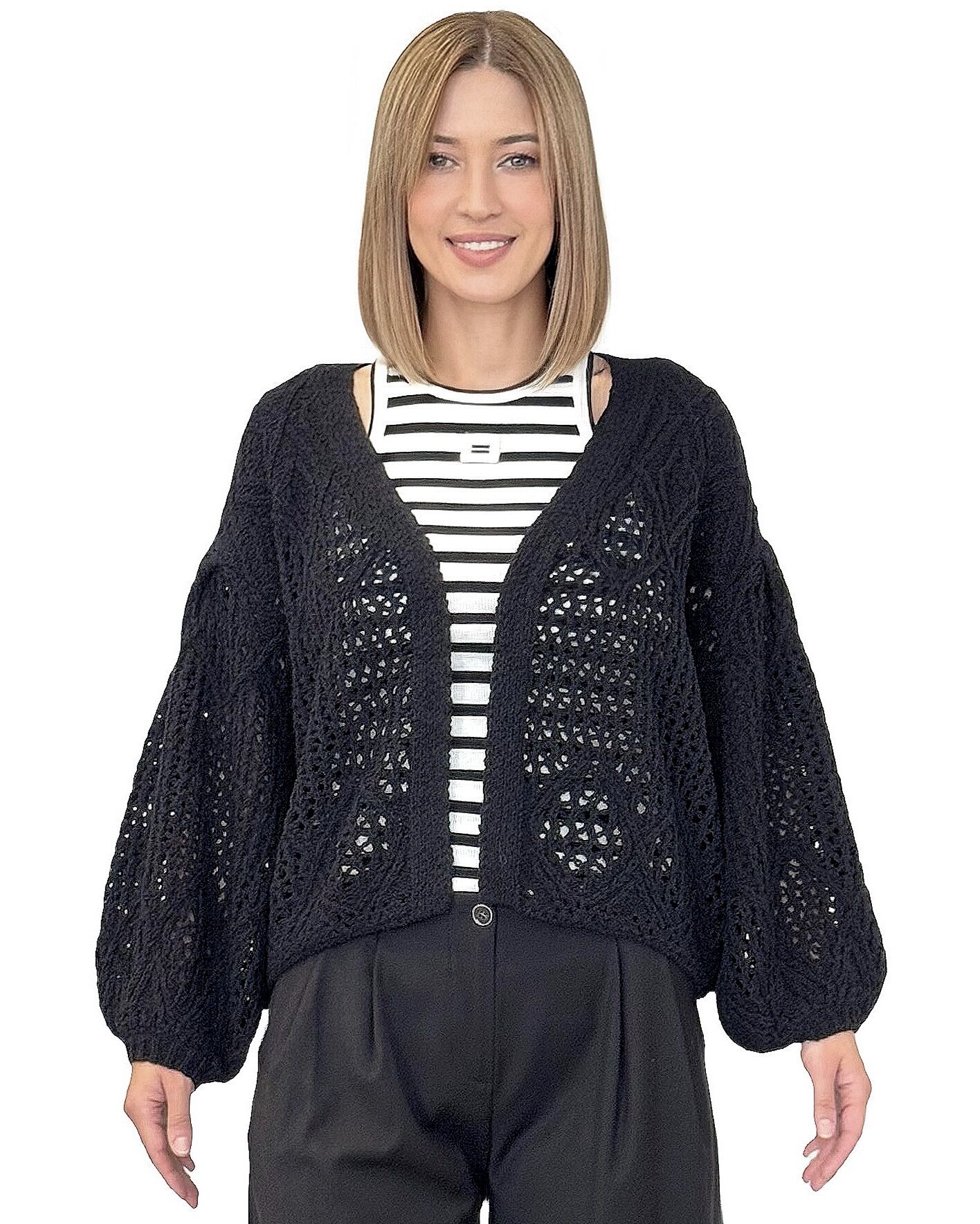 Czarny krótki kardigan damski o grubym splocie z długimi bufiastymi rękawami. Stylowy, ciepły i wygodny – idealny do codziennych oraz casualowych stylizacji.