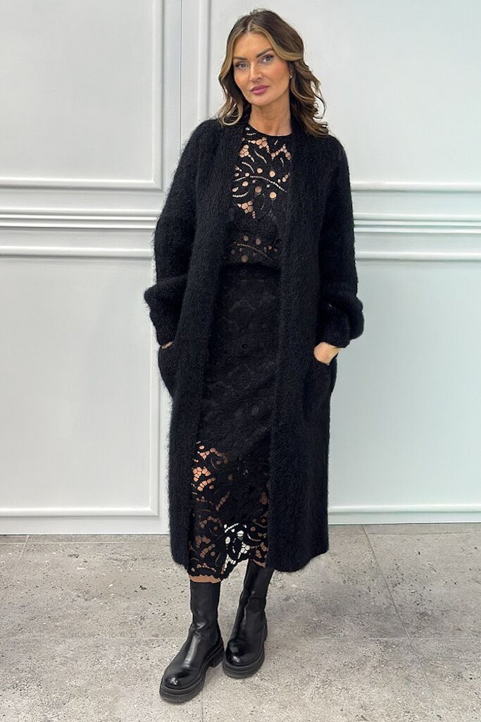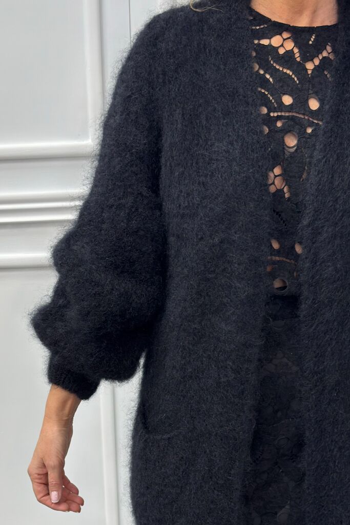 Czarny sweter długi kardigan z moherem włoskiej marki Souvenir. Miękki, ciepły i stylowy – idealny na chłodniejsze dni. Postaw na komfort i elegancję.