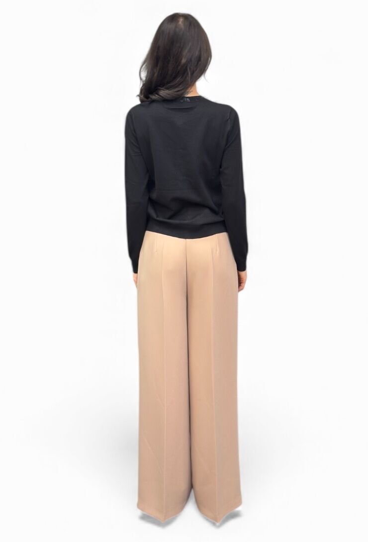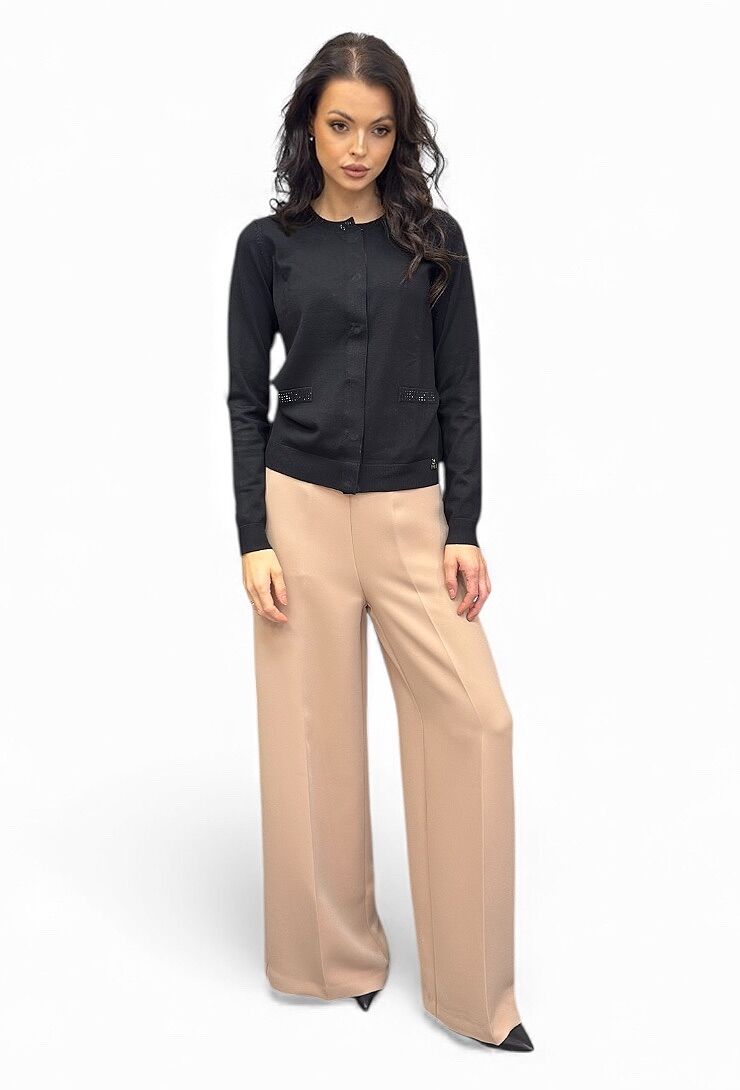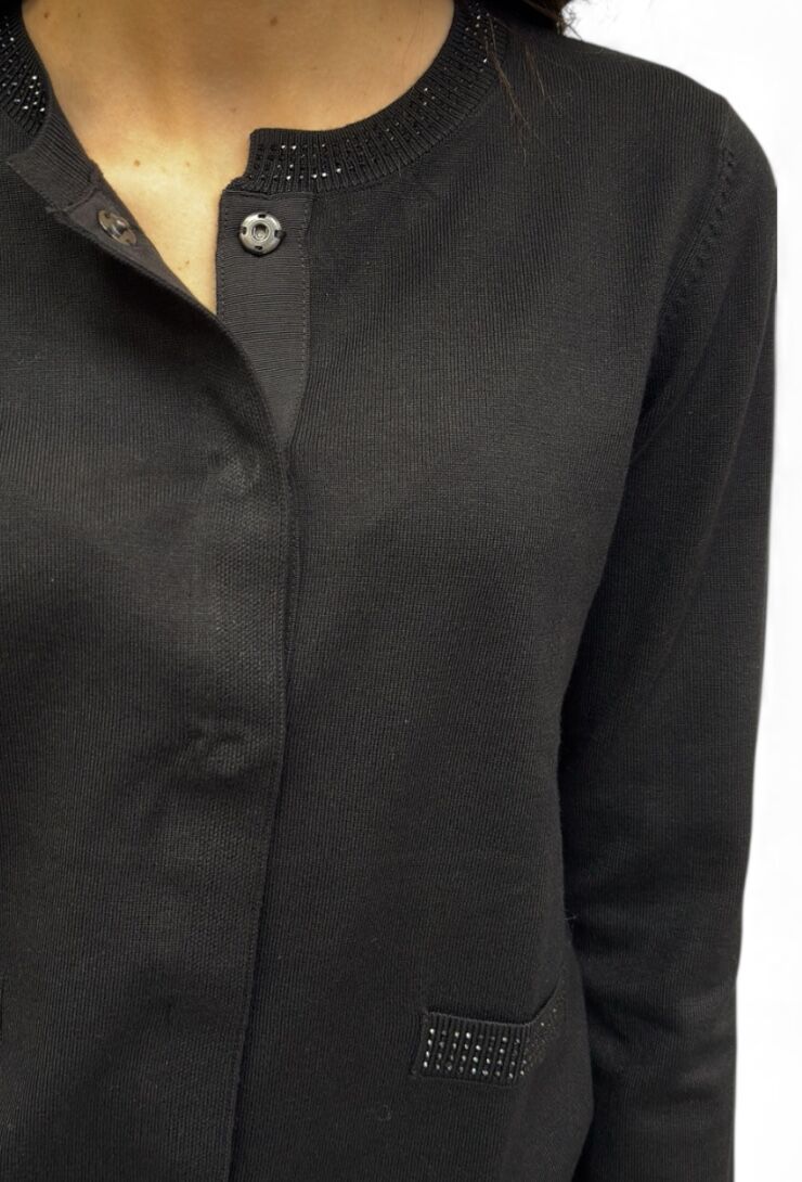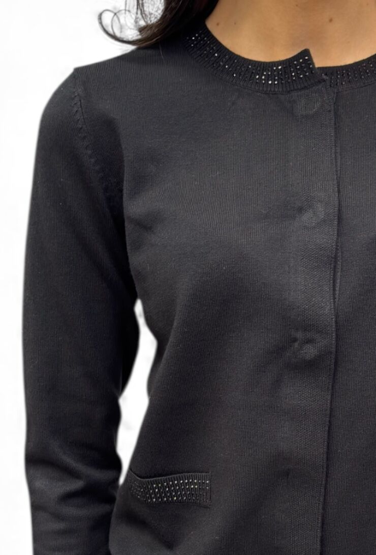 Czarny sweter, kardigan zapinany na napy z kryształkowymi aplikacjami przy kieszeniach i dekolcie od marki Artigli. Miękka dzianina, klasyczny krój.