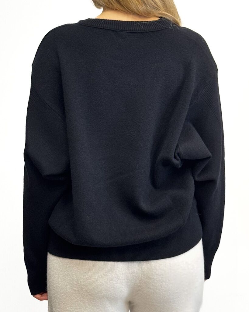 Czarny sweter z kamieniami przy dekolcie oraz luźnym kroju od marki Tensione. Stylowy, elegancki i wygodny – idealny na co dzień i na okazje.