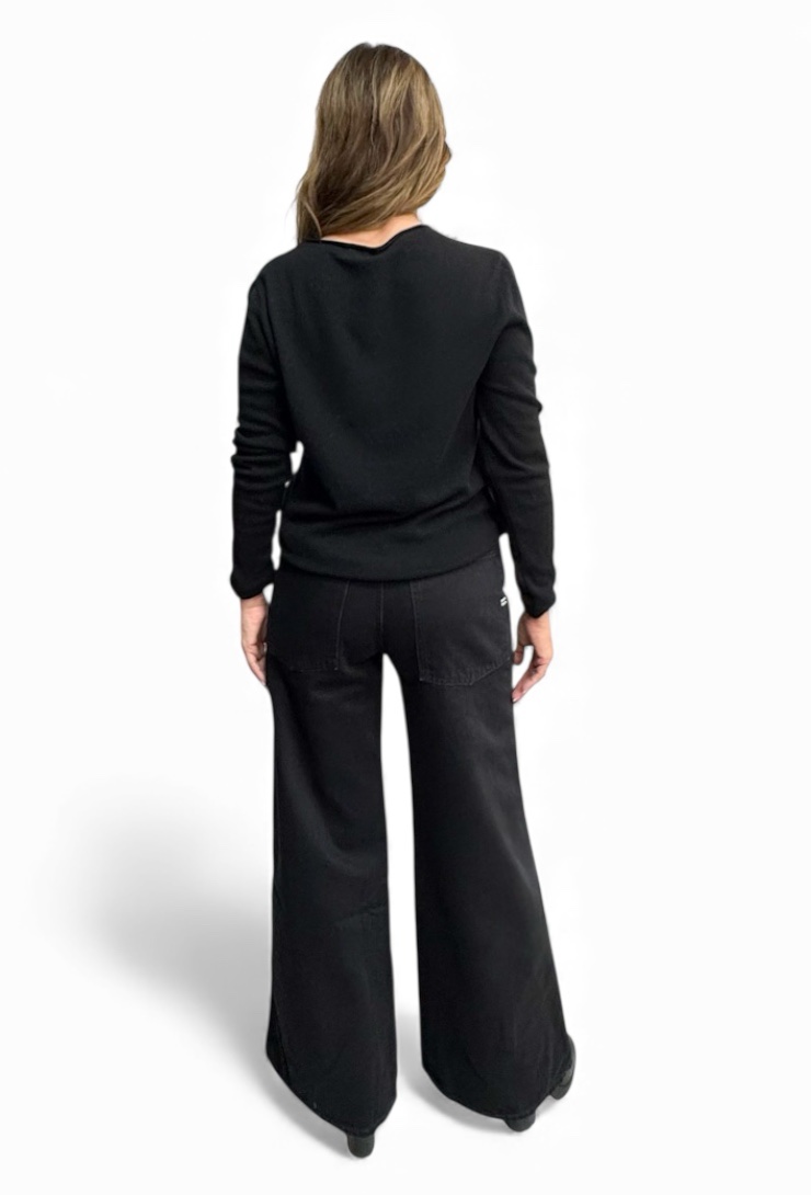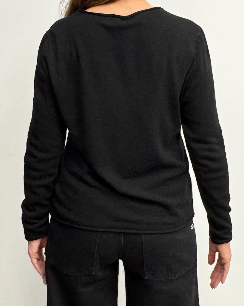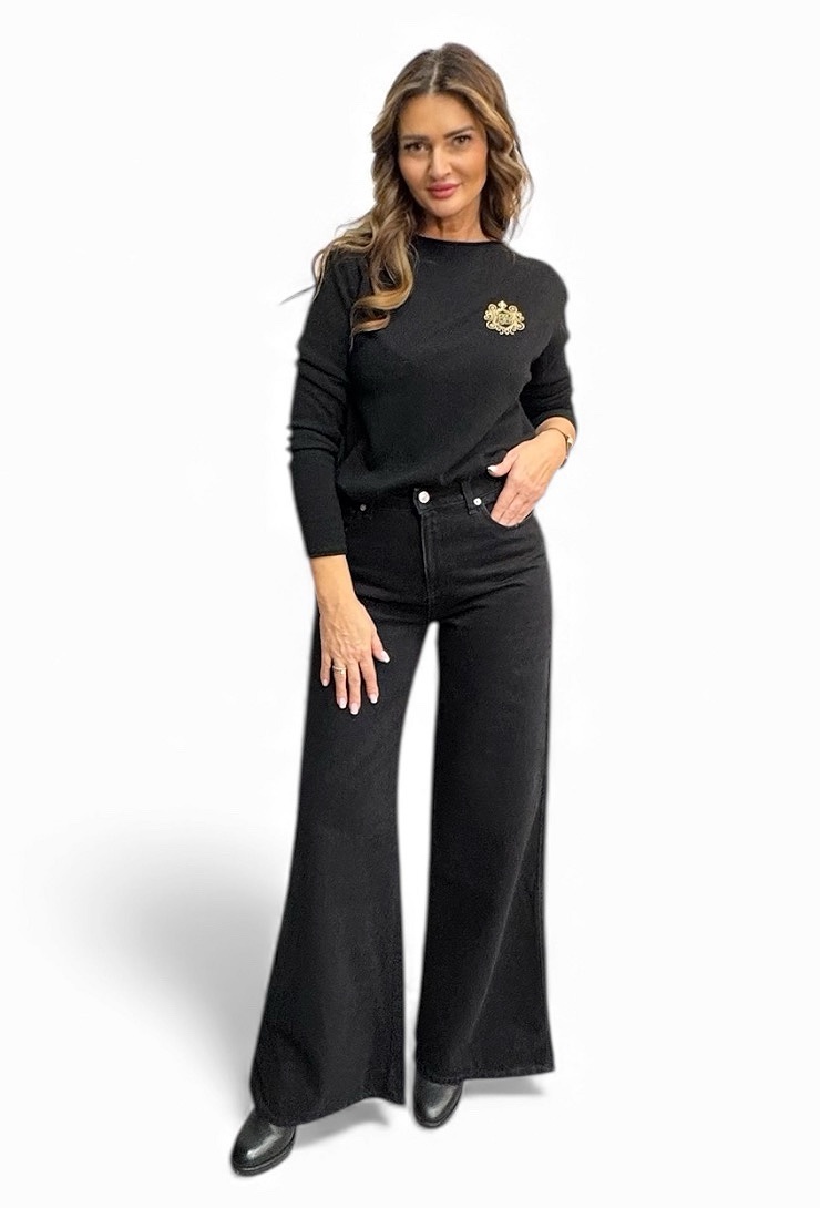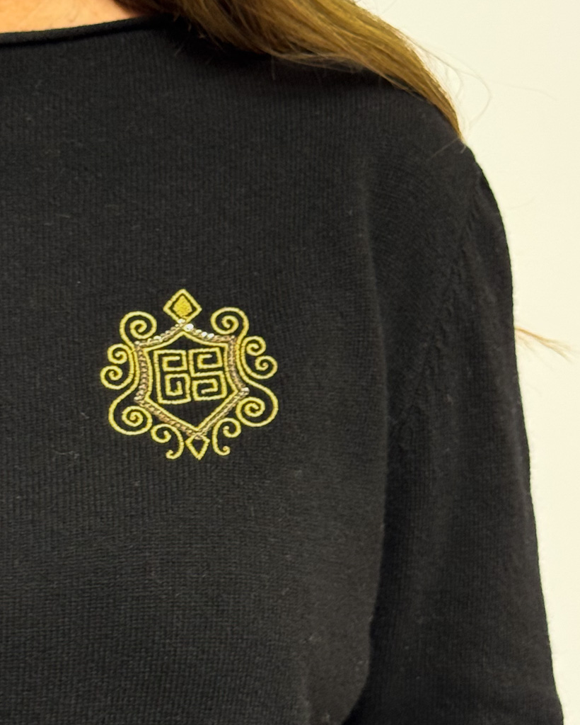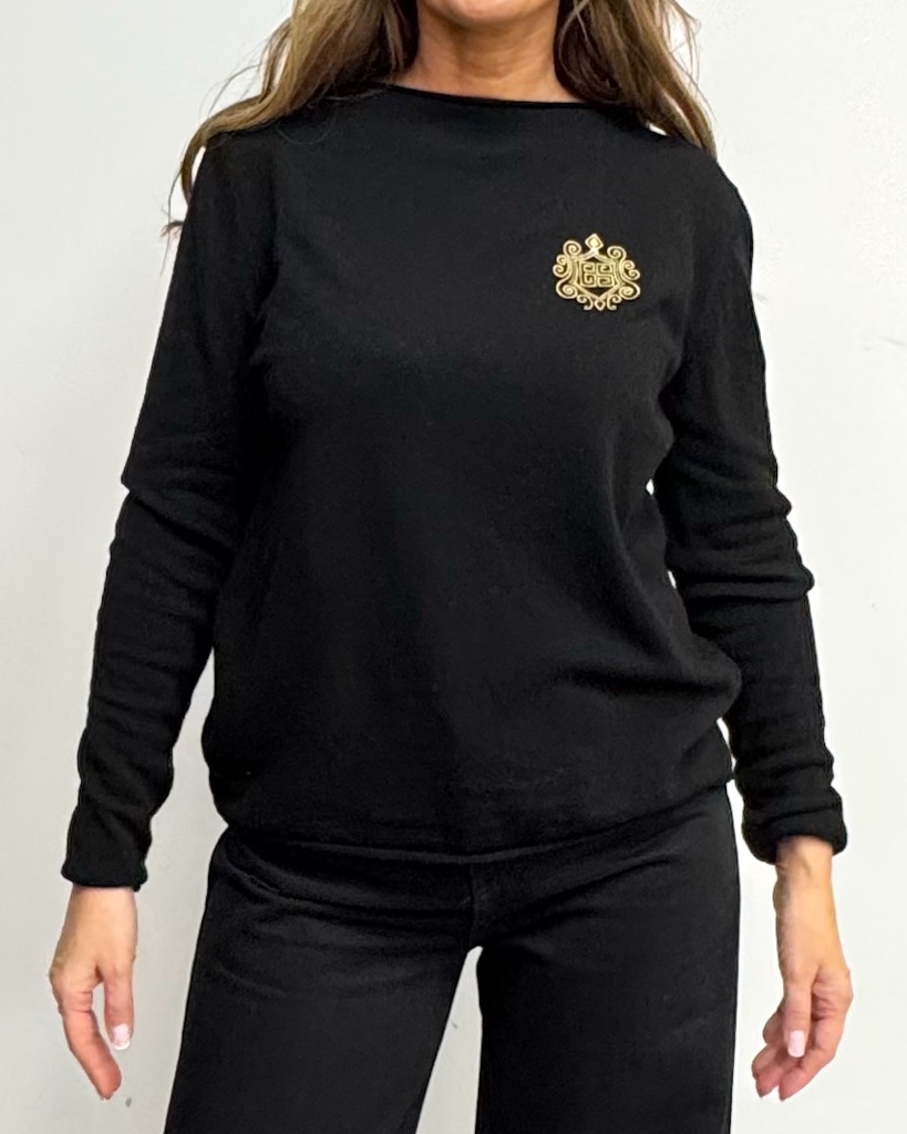 Czarny sweter z wełną i kaszmirem Gil Santucci z cienkiej dzianiny, dekoltem w łódkę i złotym logo na piersi. Elegancja w najlepszym włoskim wydaniu!