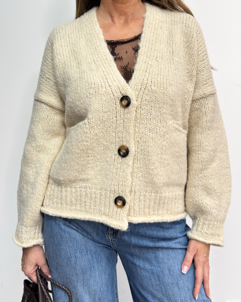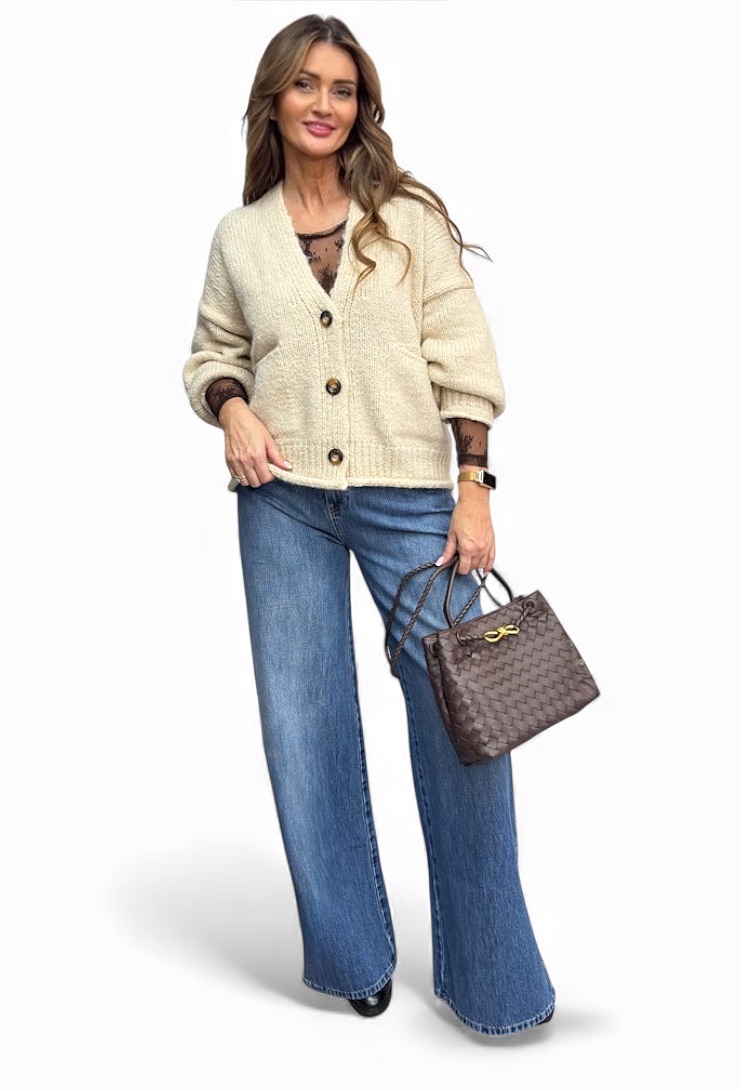 Ten model wyróżnia się naturalnym odcieniem kremu, który pięknie komponuje się z jeansami, spódnicą lub eleganckimi spodniami. Dzięki luźnemu krojowi i miękkiej strukturze dzianiny, kardigan świetnie wygląda zarówno noszony samodzielnie, jak i jako warstwa na koszulę, bluzkę czy cienki golf.