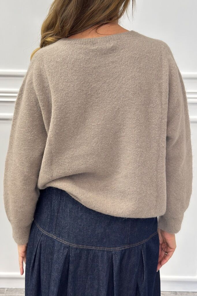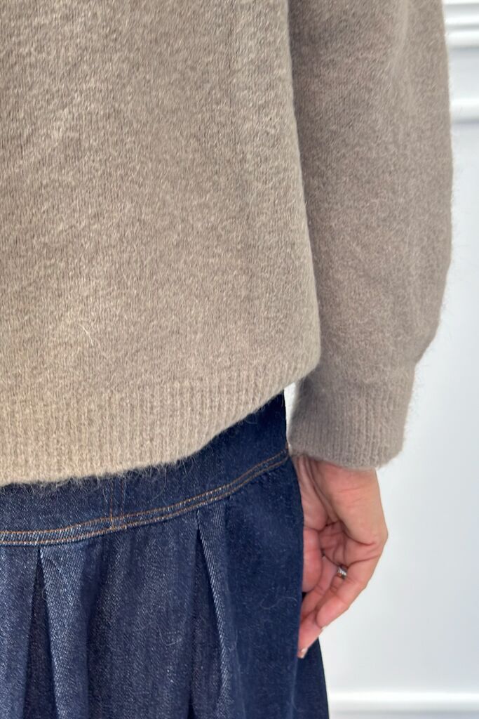 Klasyczny damski beżowy sweter z alpaką włoskiej marki Pia B to ponadczasowy element garderoby, który łączy komfort noszenia z eleganckim, minimalistycznym stylem. Wykonany z miękkiej, przyjemnej w dotyku dzianiny z alpaką, zapewnia wygodę przez cały dzień, a luźniejszy fason pięknie układa się na sylwetce, nie krępując ruchów.