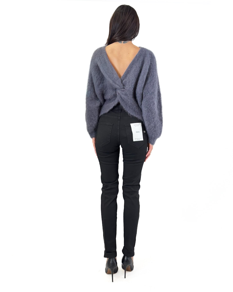 Grafitowy moherowy sweter z dekoltem w kształcie litery V na plecach to bardzo uniwersalny element garderoby, który łatwo dopasować do różnych stylów i okazji. Dzięki luźnemu fasonowi doskonale łączy się zarówno z codziennymi, jak i eleganckimi ubraniami, pozwalając stworzyć stylizacje o różnym charakterze.