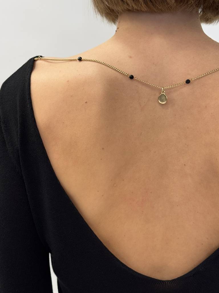 Opis: Rękaw za łokieć, dekolt okrągły, gołe plecy ozdobione złotym łańcuszkiem oraz czarnymi kamieniami, dopasowany fason