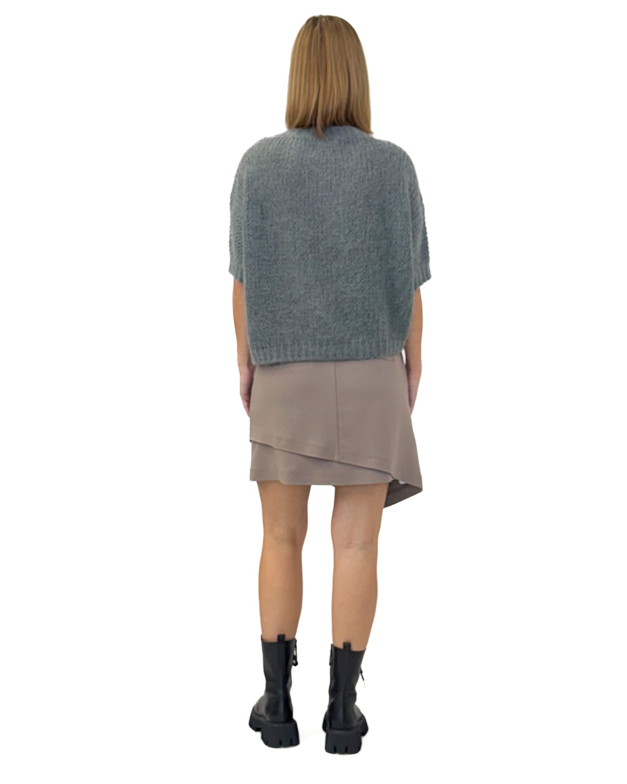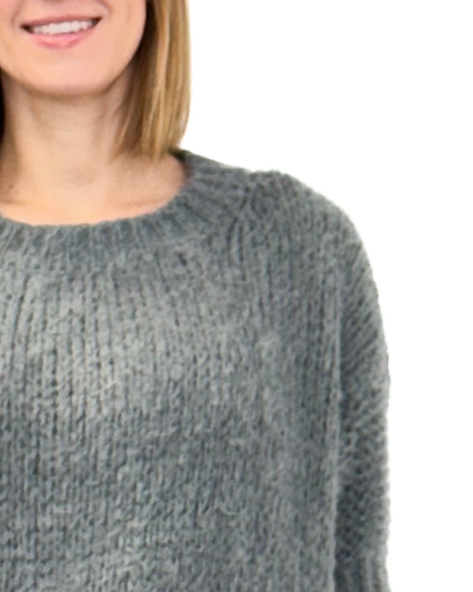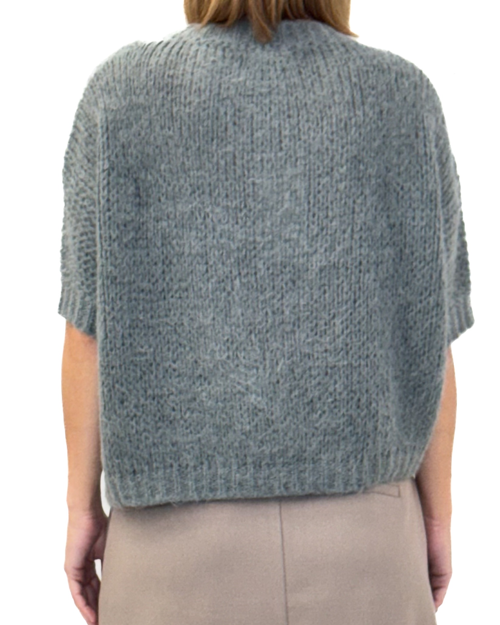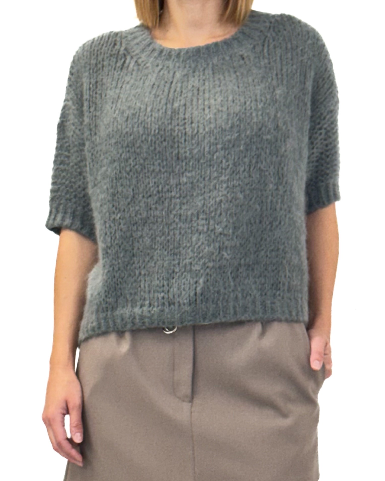 Turkusowy sweter damski z krótkim rękawem wykonany z wełny i moheru. Luźny fason z okrągłym dekoltem – elegancki, wygodny i idealny na codzień.