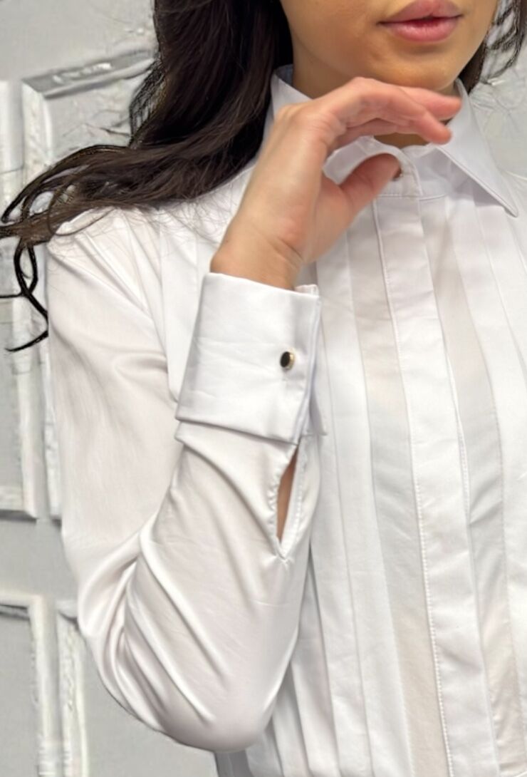 Elegancka biała bluzka damska koszula body z pionowymi plisami marki Revise. Klasyczny krój, idealna do biura i specjalne okazje. Ponadczasowa elegancja.